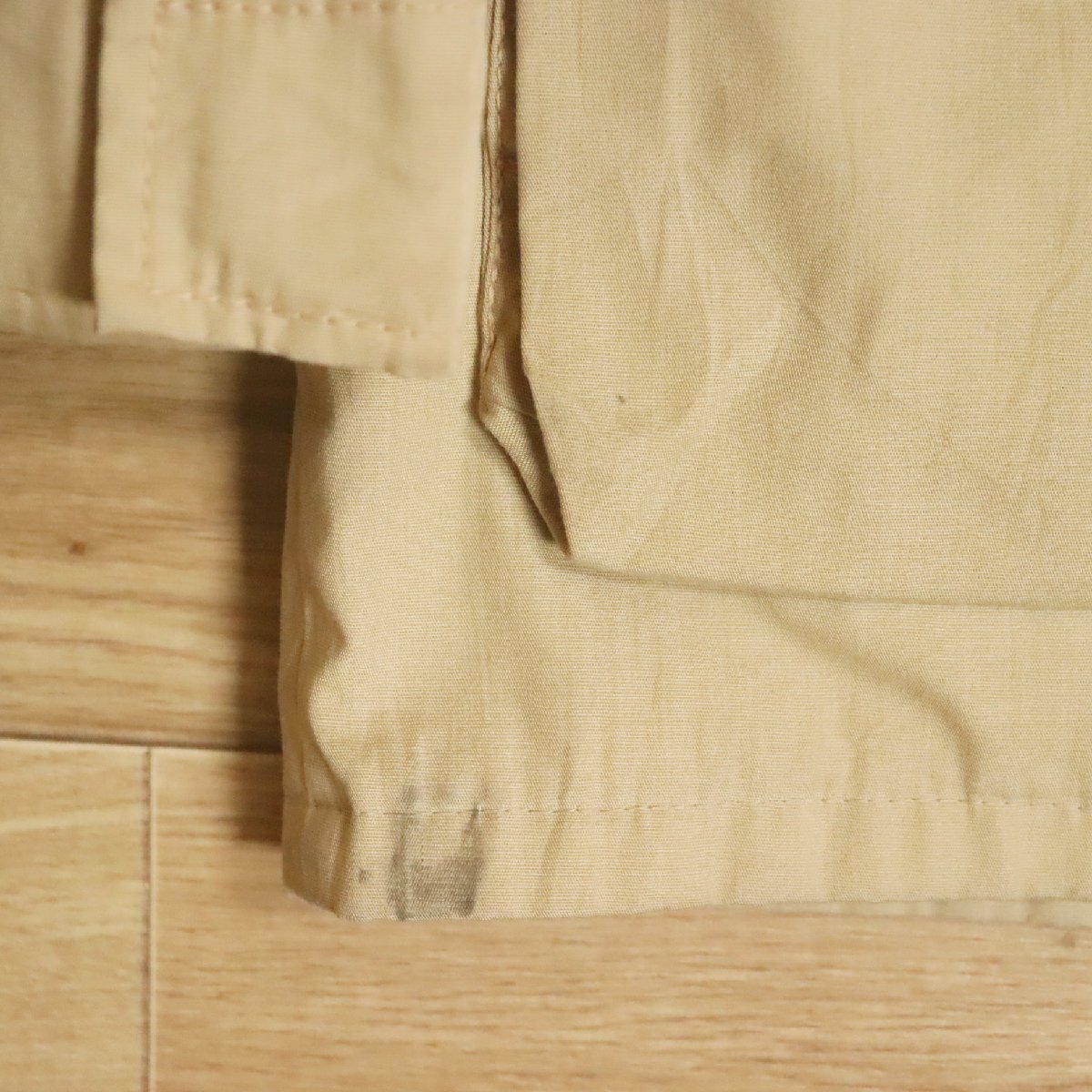 中古品です。使用感があります。写真にあるように腹部に点の汚れ、袖や背中に少し汚れ、裏地に毛玉があります。