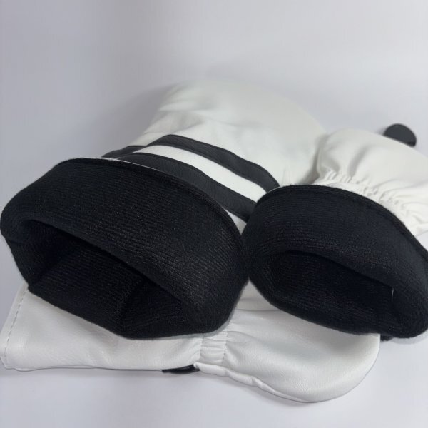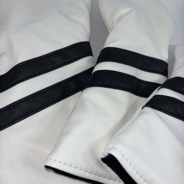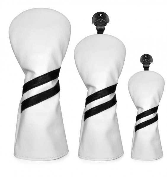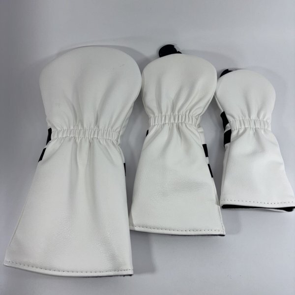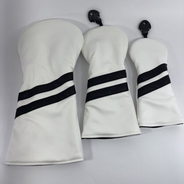 【新品】ホワイトの合成皮革製、ブラックストライプのウッド用ヘッドカバー3個セット。