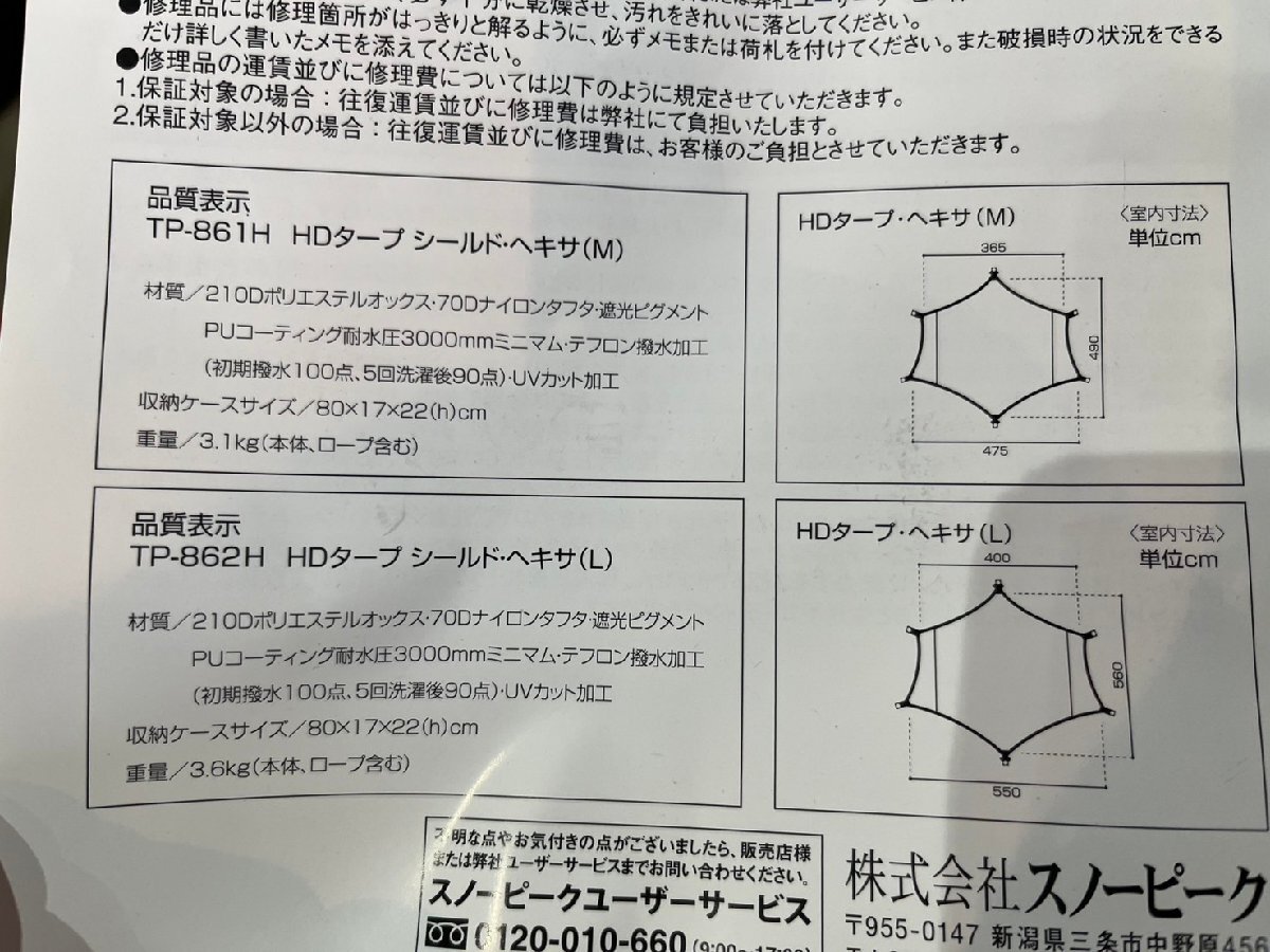 ★美品! snow peak スノーピーク TP-861H HDタープ シールド ヘキサ(M) サイズ(約)490×475/365cm 設営ポール付