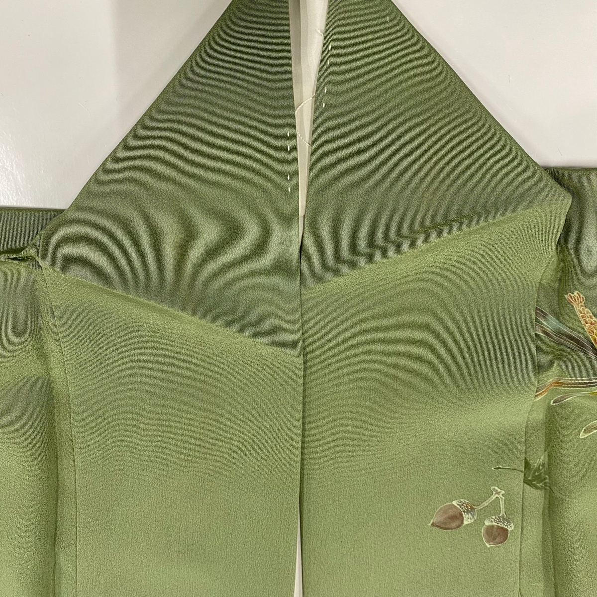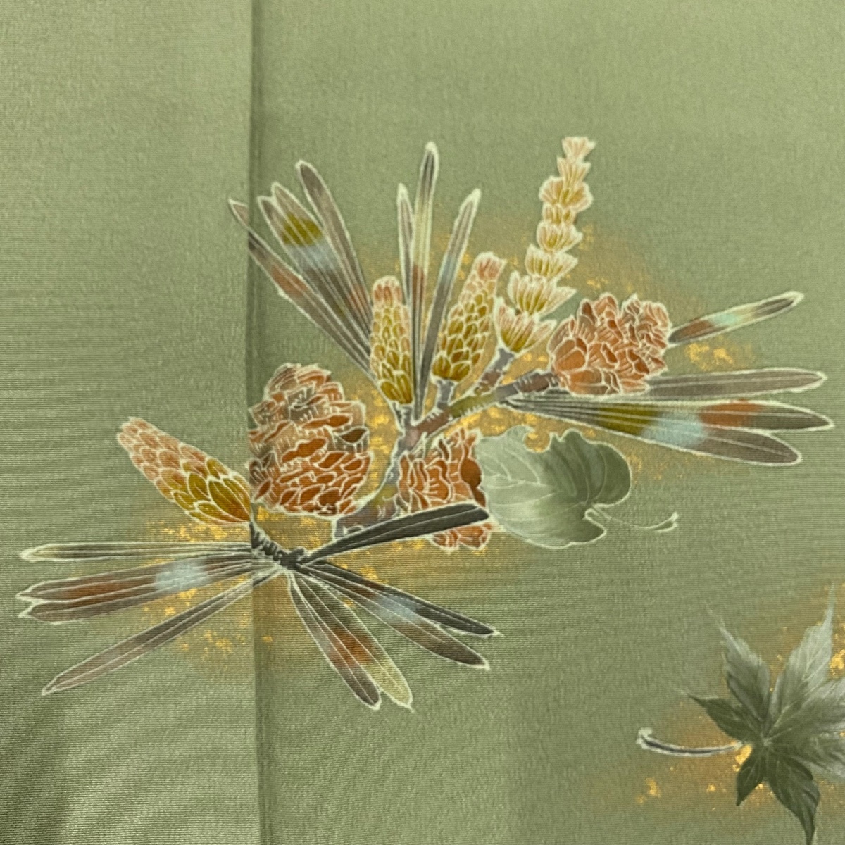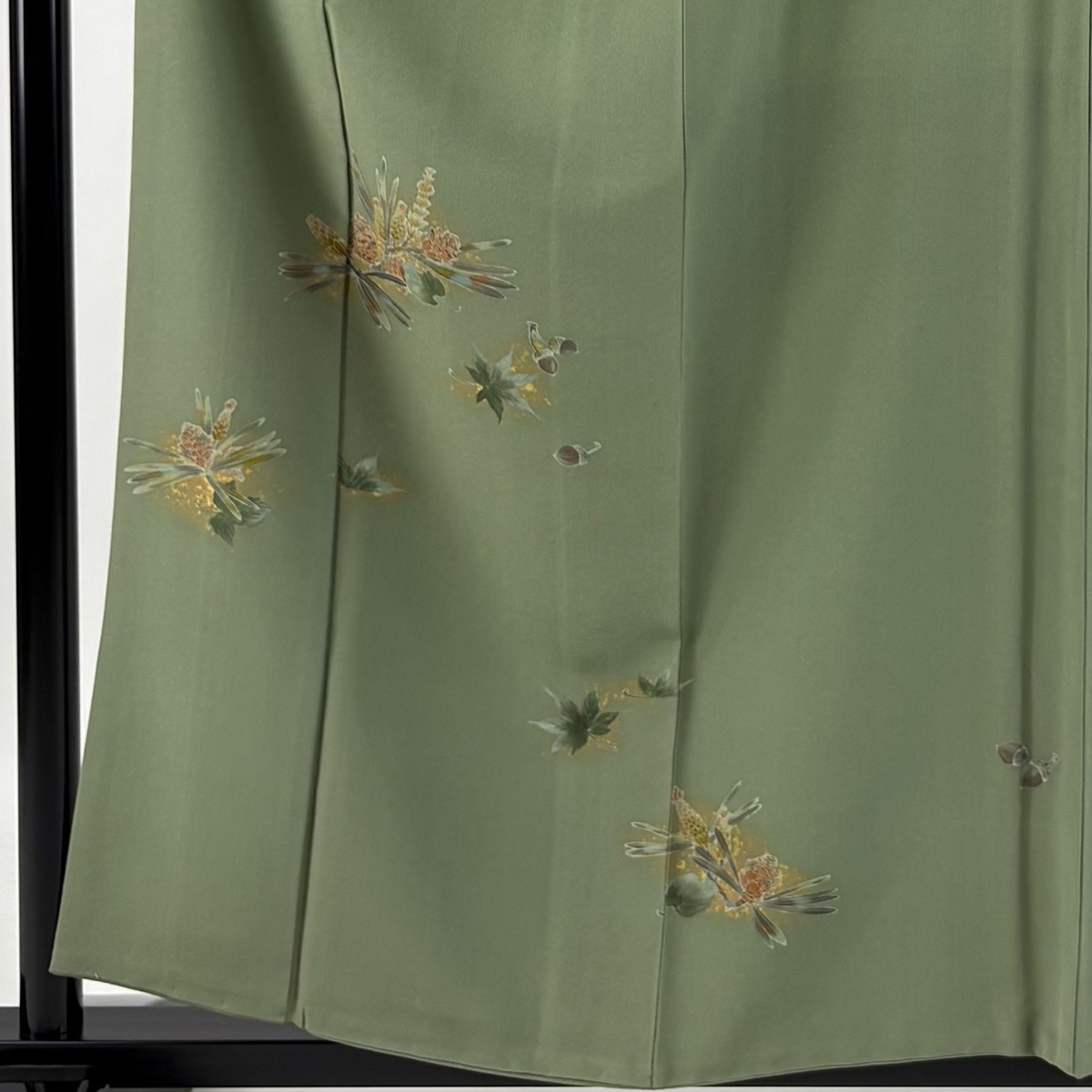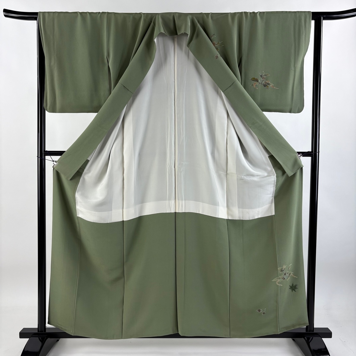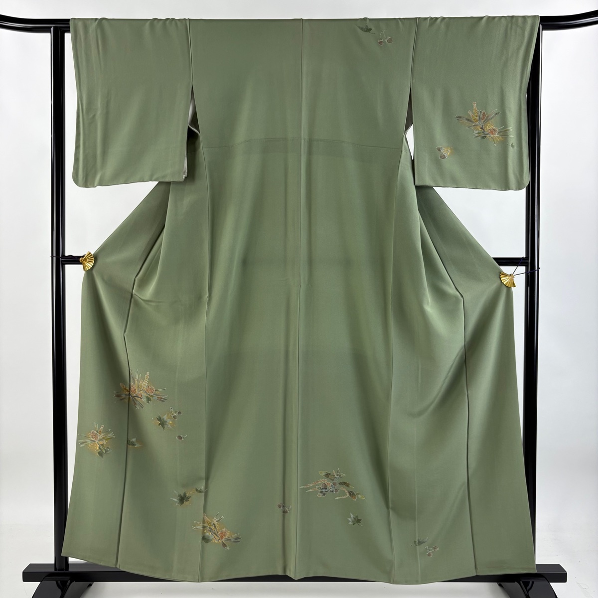 | 付下げ 美品 秀品 松笠 楓 金彩 灰緑 袷 身丈158 裄丈63.5 S 正絹 【中古】 |