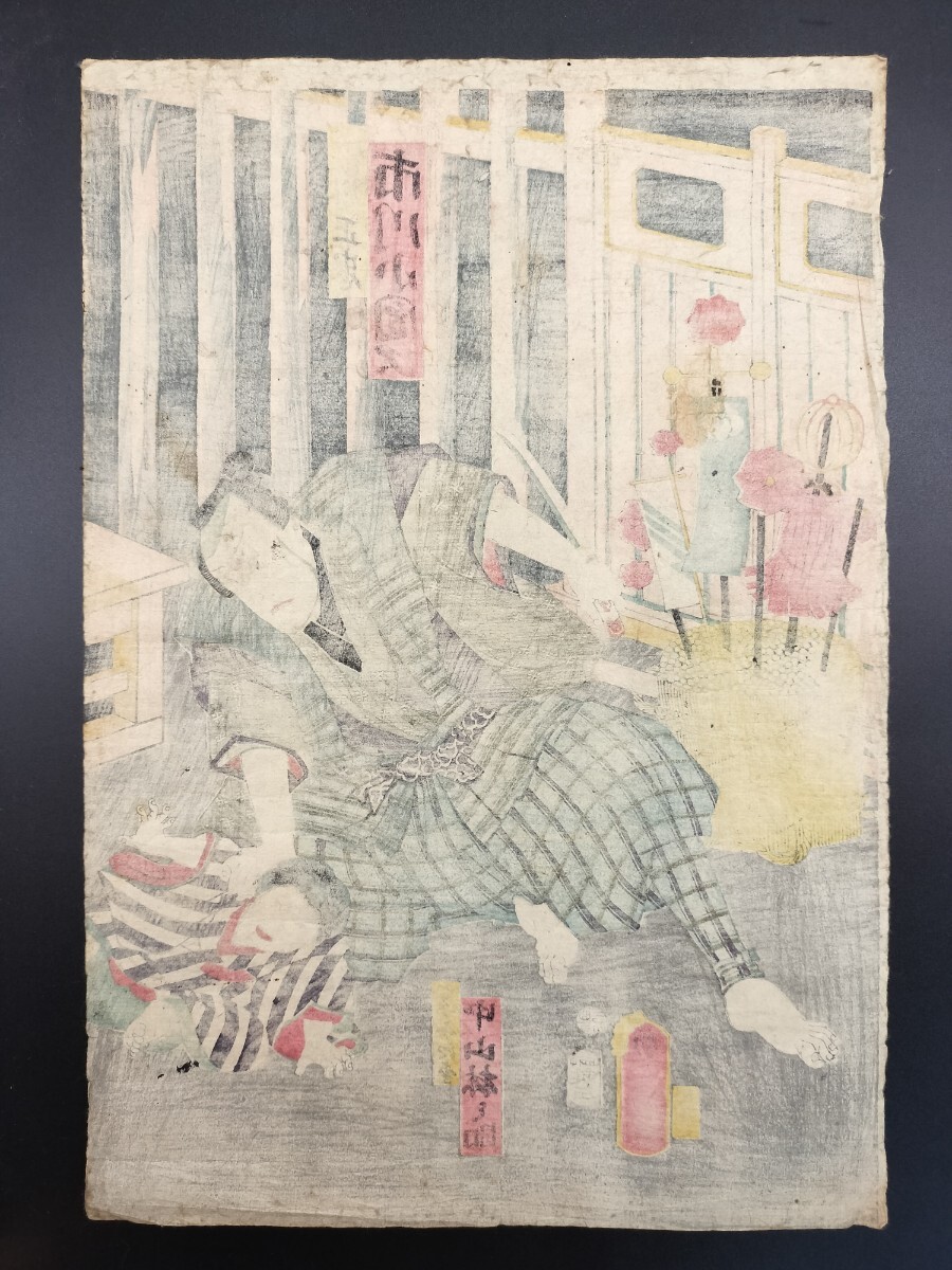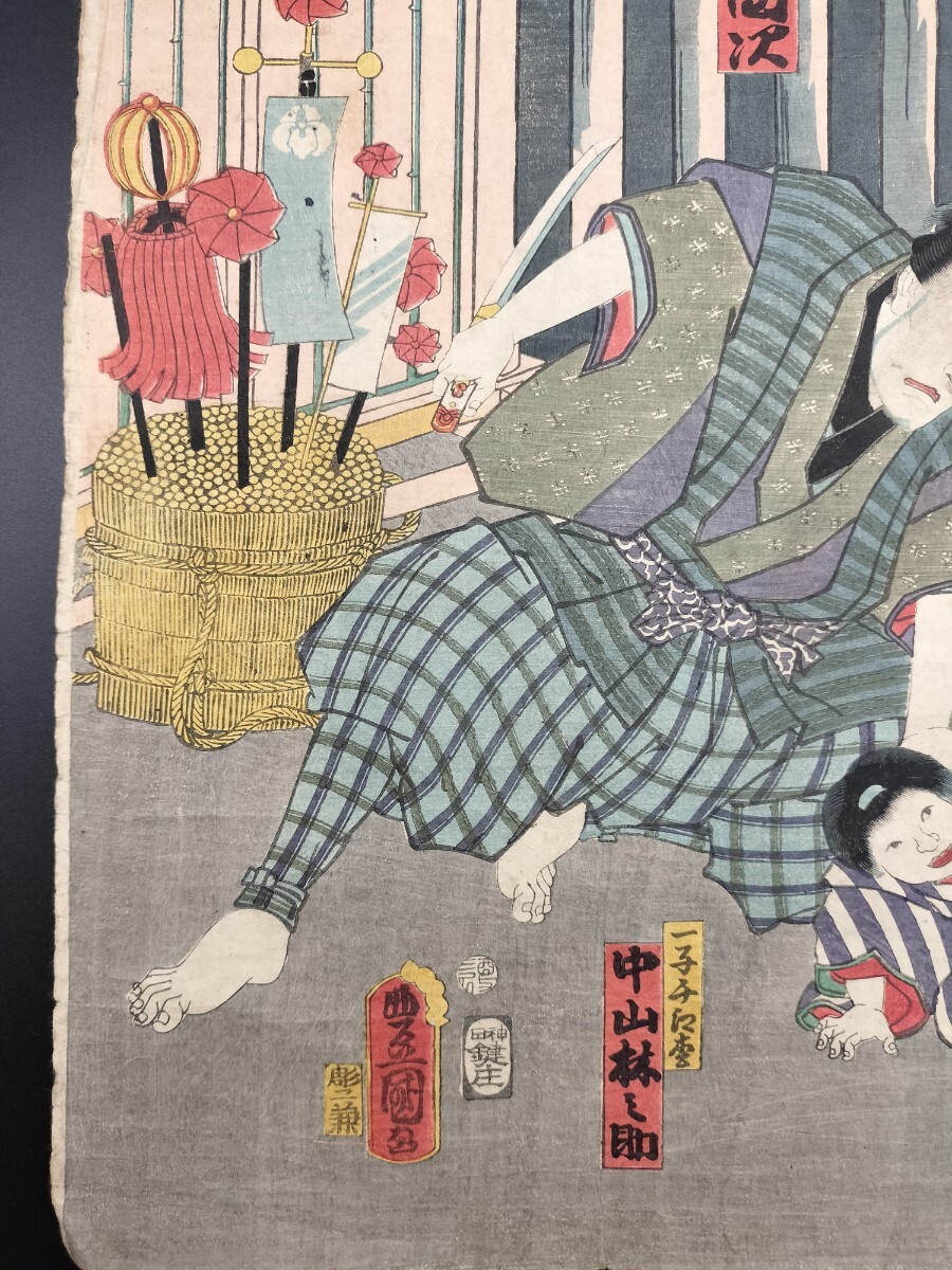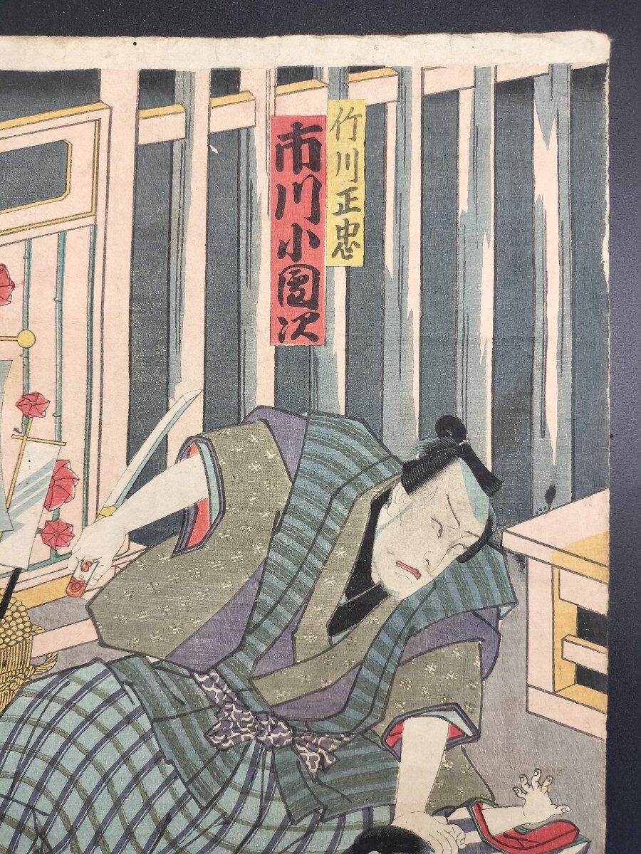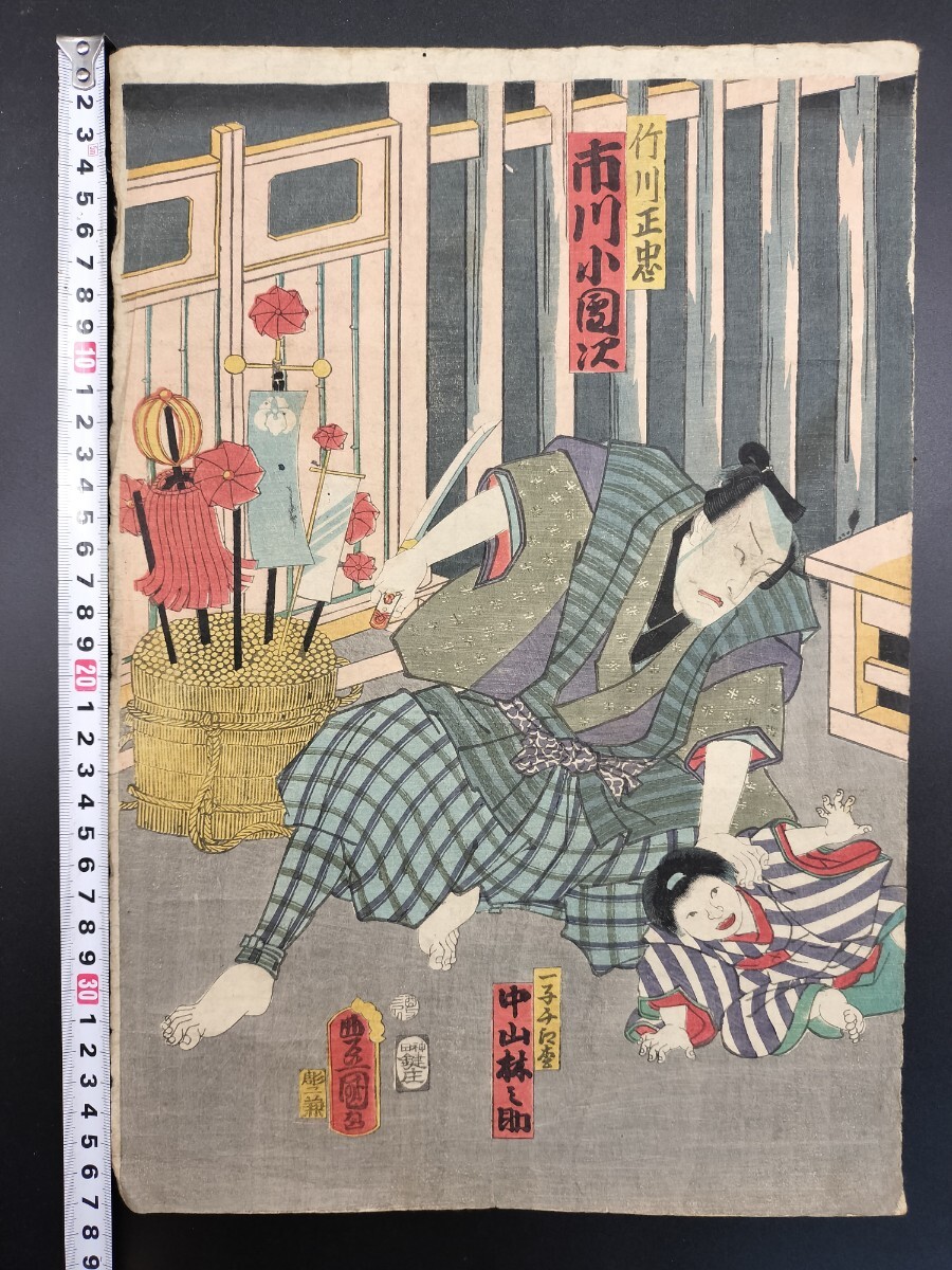 江戸期/真作 歌川豊国 「竹川正忠 市川小団次 一子千江松 中山林之助」本物浮世絵木版画 歌舞伎絵 役者絵 芝居絵 錦絵 大判 裏打ち