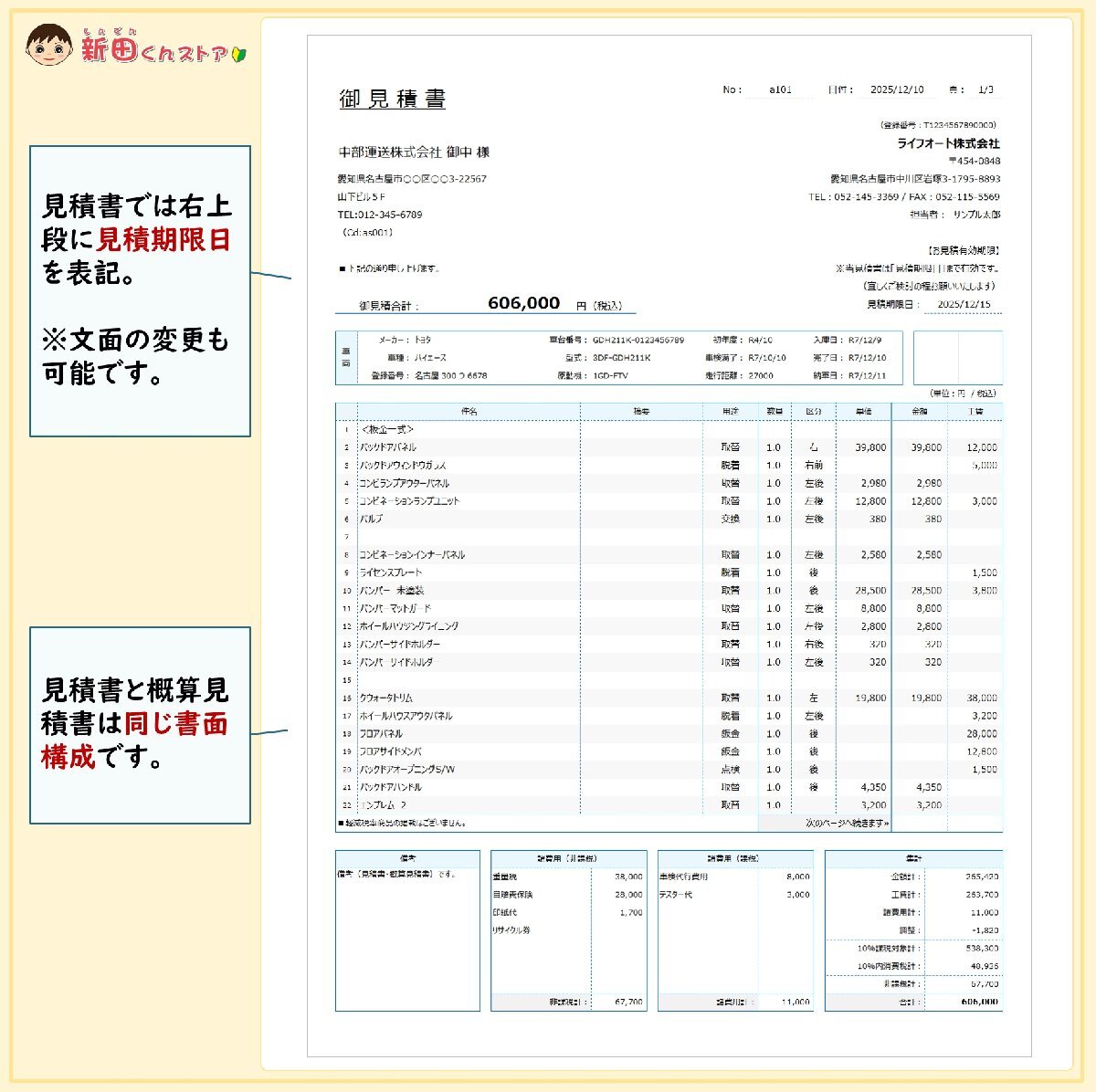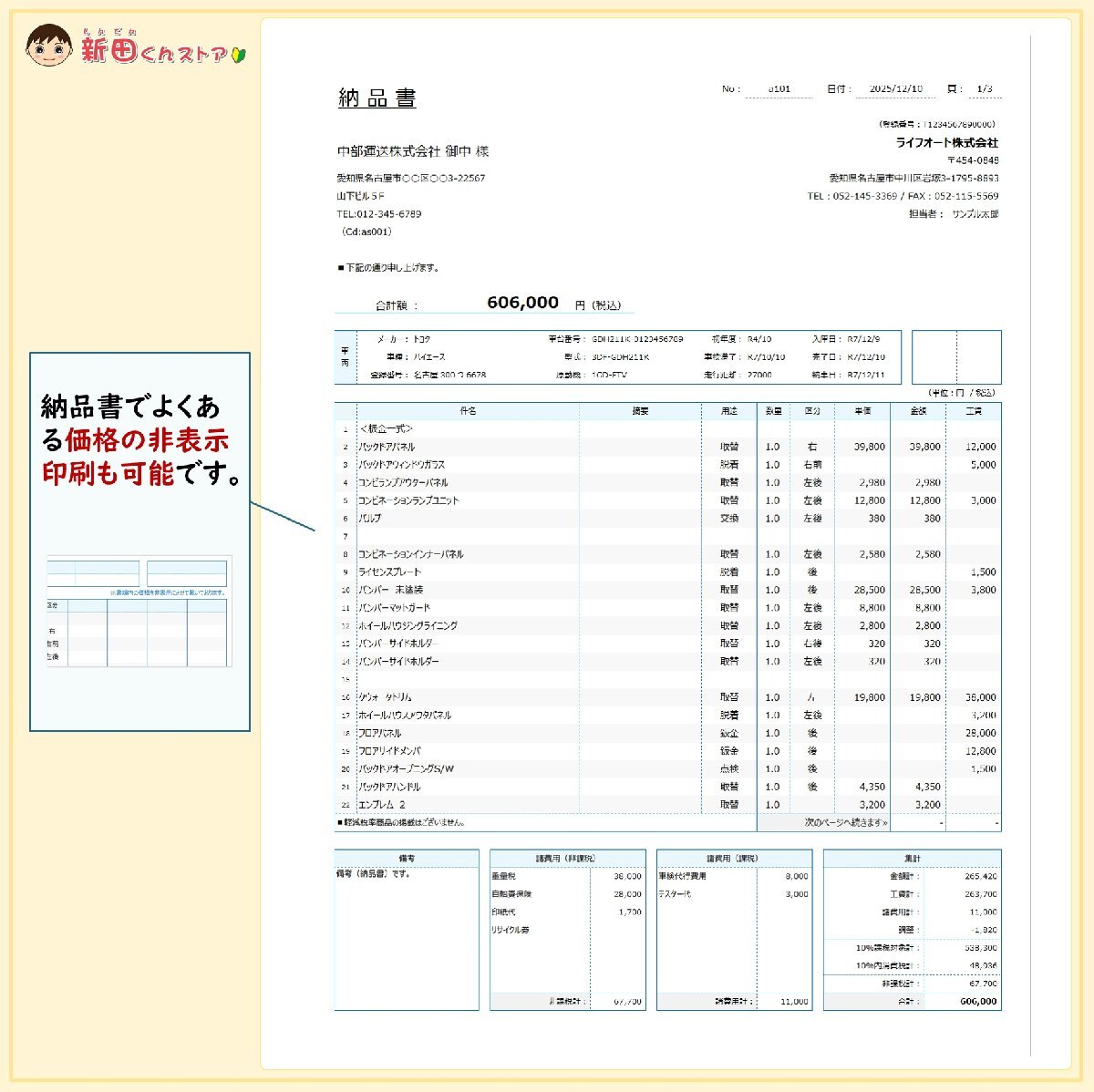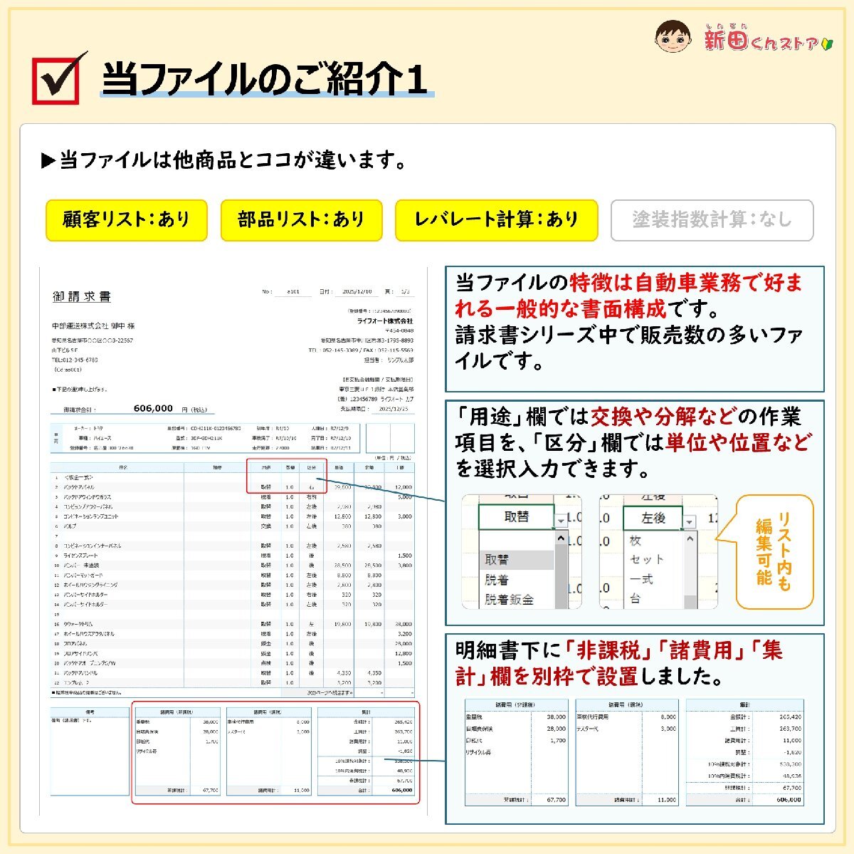 ■商品概要 ・自動車業務系・請求書作成ファイルです。 ・A07シリーズは自動車業界で一般的に利用される書面構成です。 ・修理、車検、板金塗装など幅広い業務で利用可能。 ・1回の入力で各書類が簡単に作れます。 ■A07-cシリーズの機能は? ≫時間指数によるレバレート計算が可能。 ≫良く請求する顧客をリストへ登録可能。 ≫良く利用する部品をリストへ登録可能。 ※上記リストは入力補助を目的とした簡易的なものです。 ■当A07-c2商品はここが違う! ・当商品は明細下に別枠で非課税と諸費用欄のあるタイプです。 ※法定費用や諸費用を分けて掲載したい方にお勧めです。 ※他商品との違いは書面の見た目だけで使い方は同じです。 |