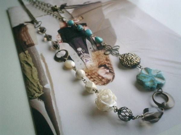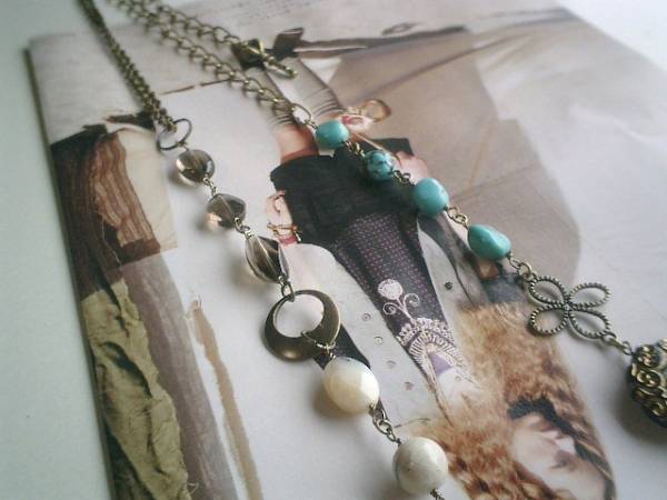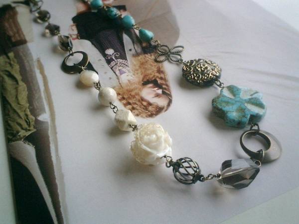繊細なディテール・・シリーズです♪フラワー・モチーフ・・ターコイズやスモーキークォーツに薔薇やお花のチャームを合わせてロマンチックなネックレスです♪10ミリから18ミリ位のコインやオーバル、ラフカットなどデザイン違いのスモーキークォーツ、11ミリ位のタンブルのターコイズ、10ミリの丸玉、オーバルのアフリカンオパールに25ミリのマグネサイトのお花や樹脂薔薇やお花のチャームを合わせました♪長さは全長85センチ位で調節自由です♪2連にされても素敵です♪♪お揃いのブレスレットも出品しています♪♪シンプルで飽きのこないいつまでも着けられるデザインを考えて作りました!ハンドメイドをご理解頂いてノークレーム、ノーリターンでお願いします