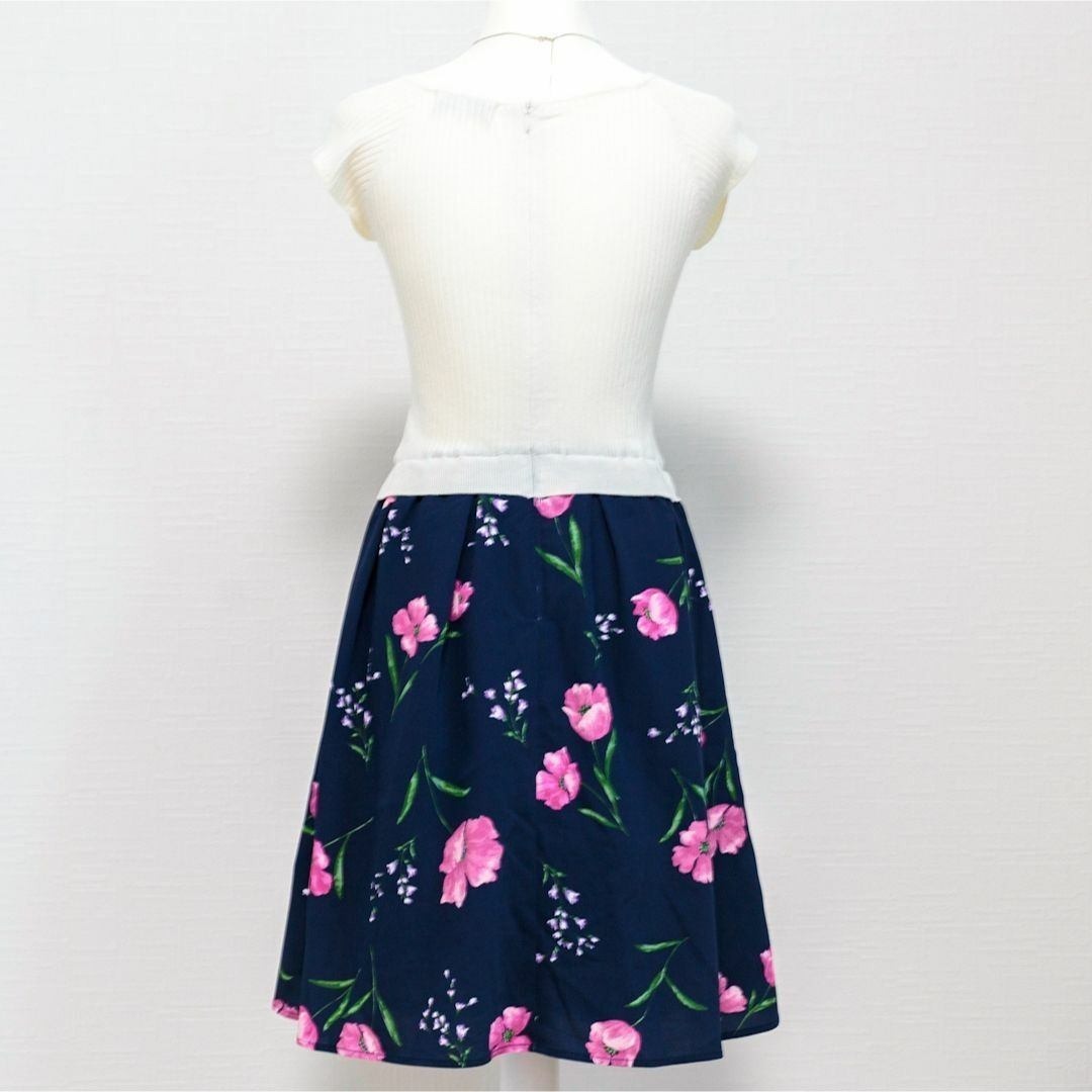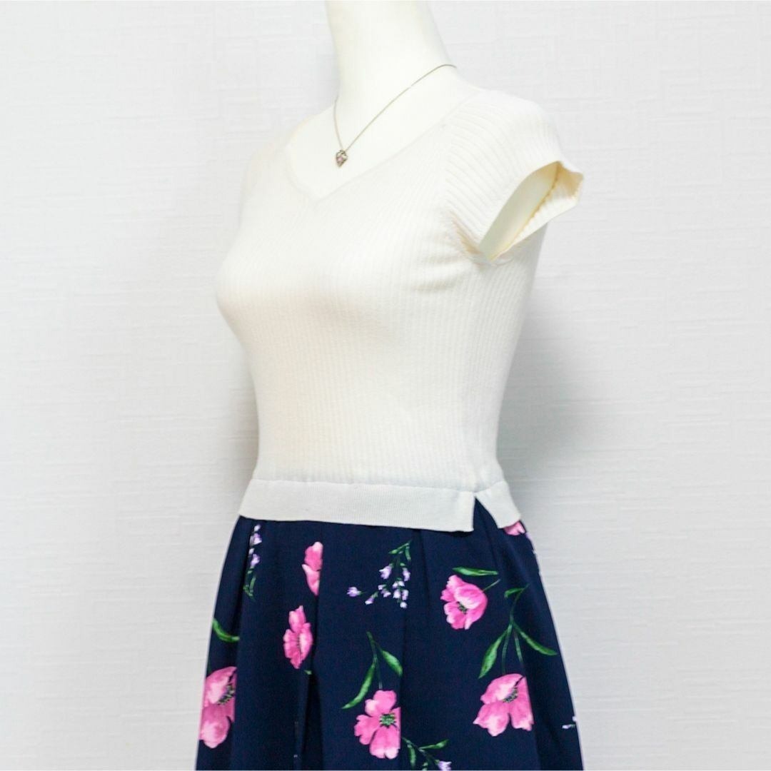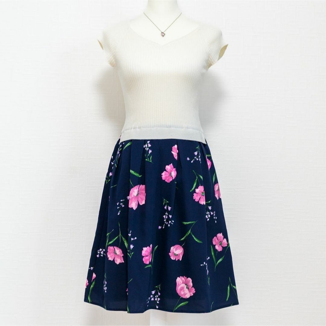 フラワープリントスカート フレンチスリーブリブニット ドッキングワンピ ひざ丈 バックファスナー スカート部裏地あり
