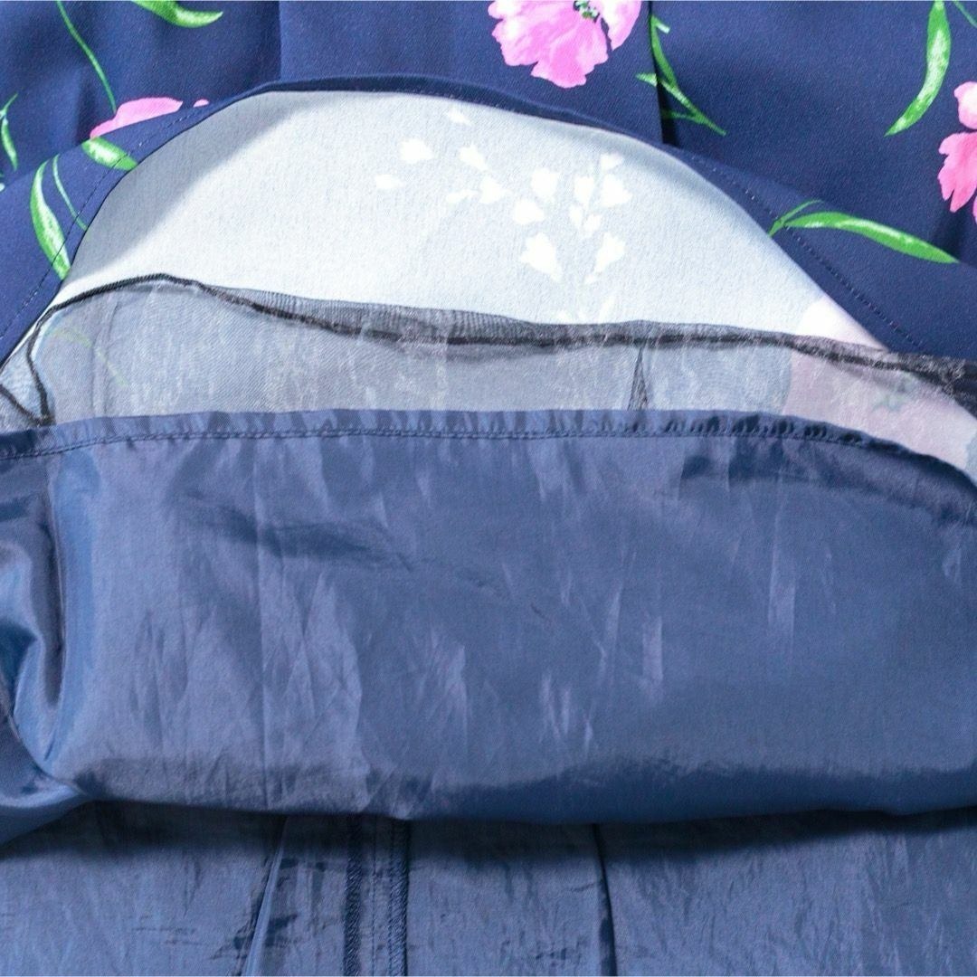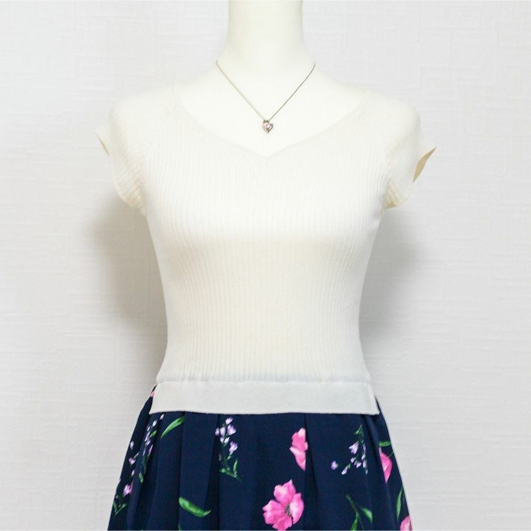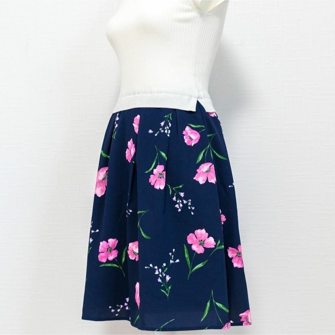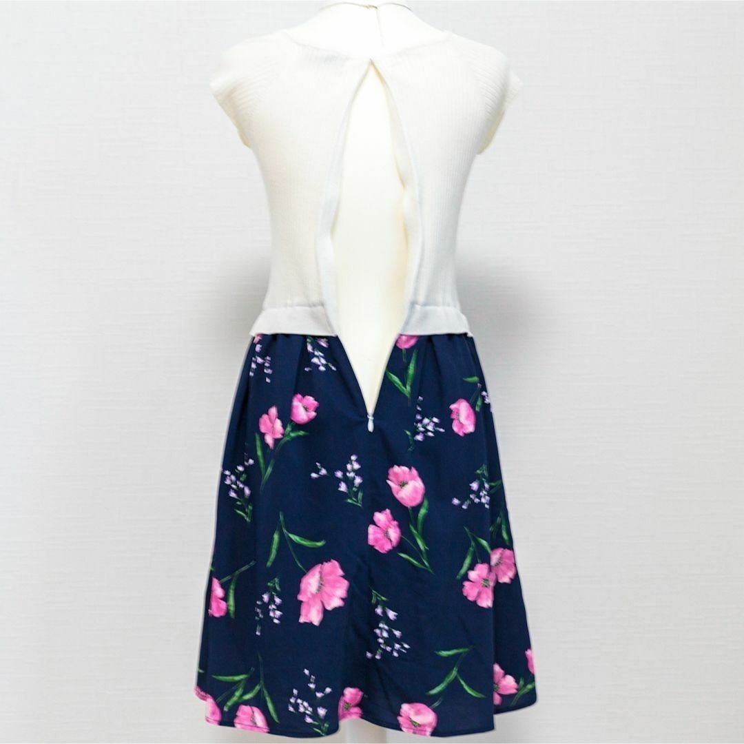 フラワープリントスカート フレンチスリーブリブニット ドッキングワンピ ひざ丈 バックファスナー スカート部裏地あり