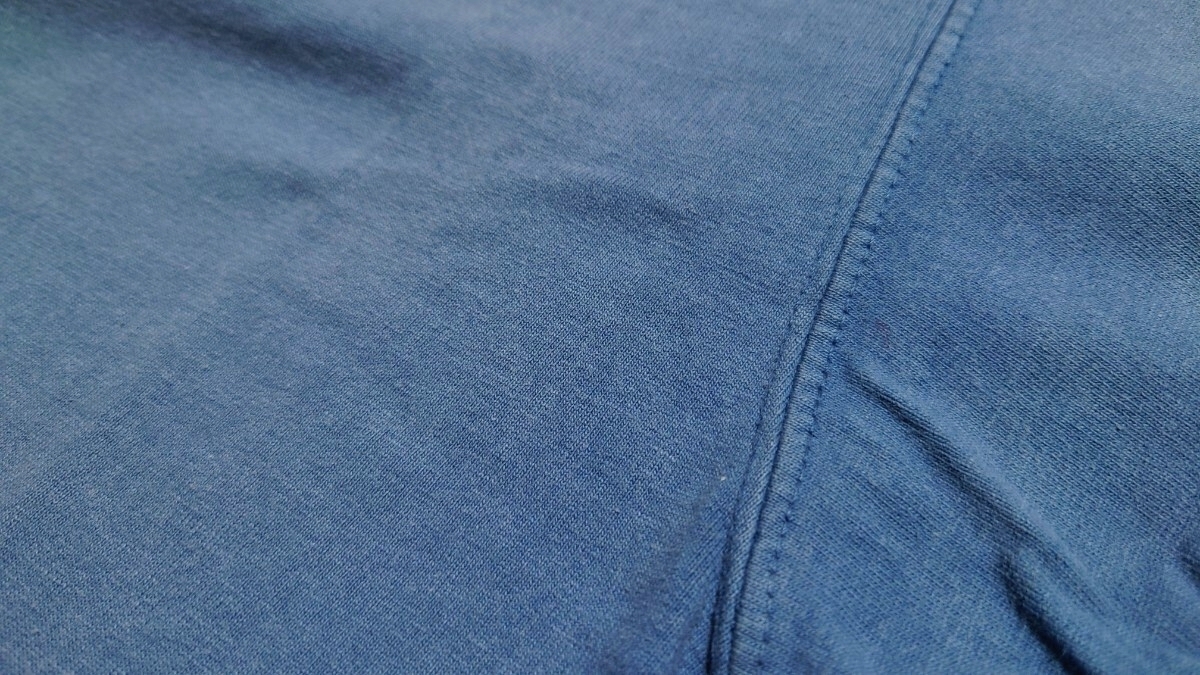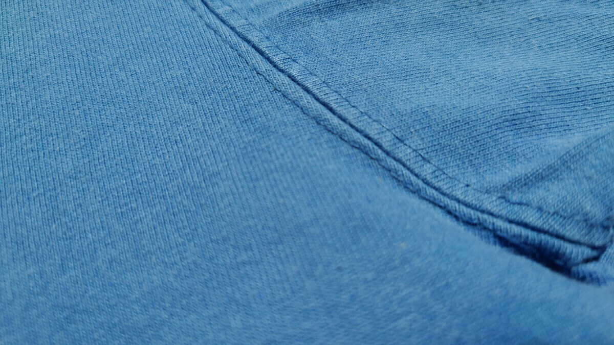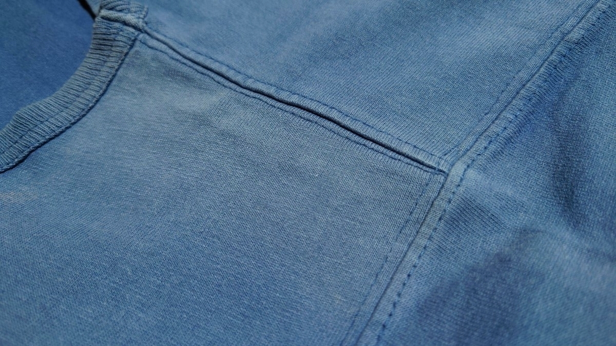 良い意味でがさっと乾いた質感で、バインダーネック、2本針縫製とディテールも拘っています。