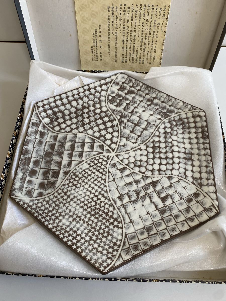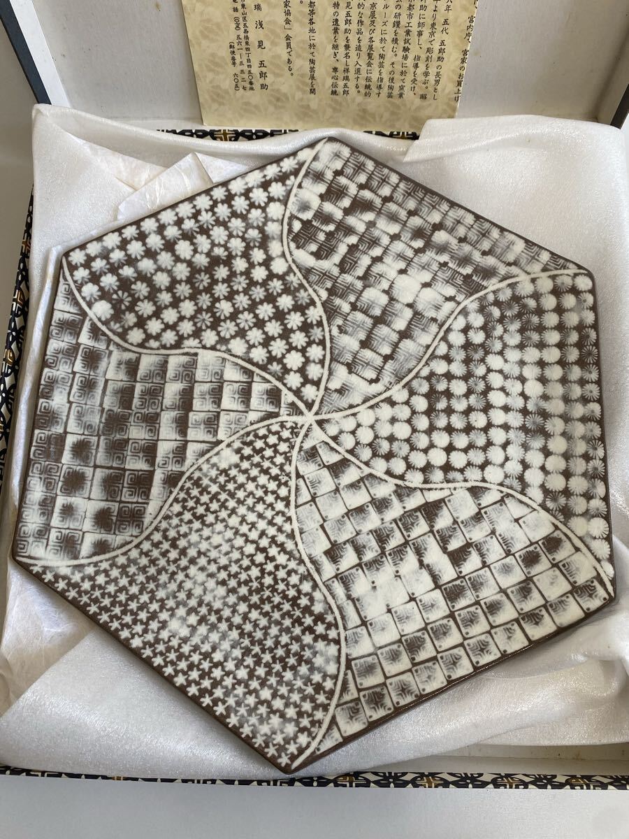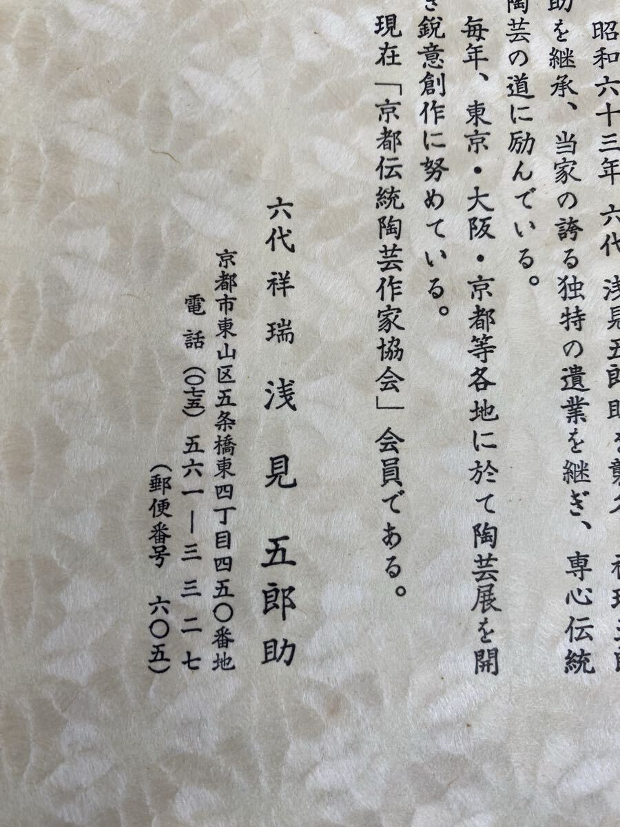 歴代についてですが、2代 五郎助(生没年不詳)は磁器による煎茶道具の製作も行い、還暦を境に「五祥」と名乗るようになり、主に茶道具を製作します。3代 五郎助(生没年不詳)は、2代目の養子にあたり、染付、刷毛目、三島手を得意とし、煎茶道具を手がけました。4代 五郎介(1893~1967)は、大正15年(1926)に襲名します。京都陶磁器工業組合理事長等の公職に就きます。帝展に入選し「柘榴(ざくろ)紋花瓶」が賜宮内省御買上になりました。5代目 浅見五郎助(1923~1988)は、京都工芸繊維大学卒業後、1947年より2年間、国立陶磁器試験所において研修します。1967年に5代 浅見五郎助を襲名。三島手を得意として食器の製作までもしていました。