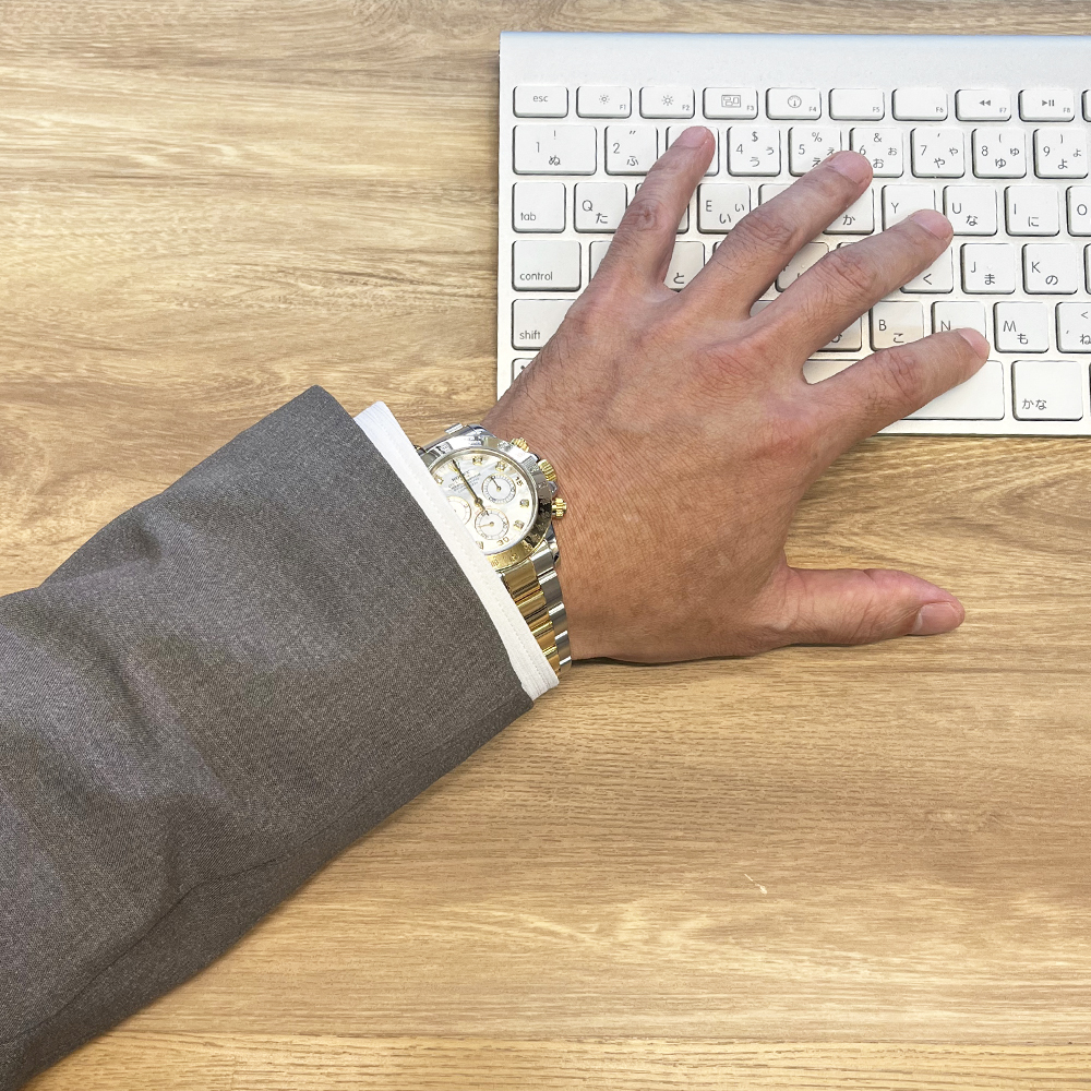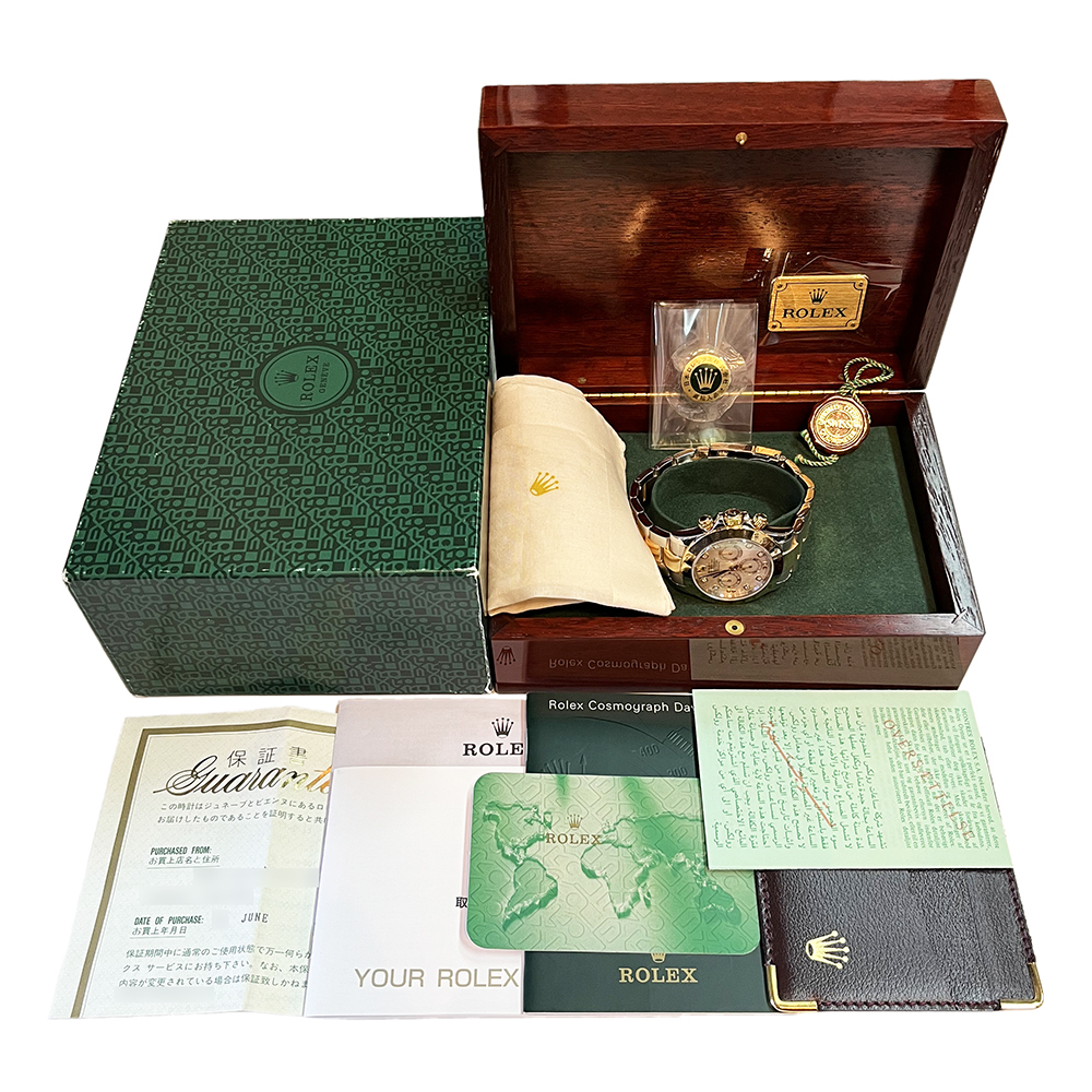 コメント | ロレックス デイトナ 116523NG が入荷しました。2000年、ロレックス社悲願の完全自社製クロノグラフ・ムーブメントを搭載し、完全マニュファクチュール化を果たしたデイトナのコンビモデルです。美しいホワイトシェル文字盤には純正のダイヤモンドインデックスが輝き、まさにラグジュアリースポーツと呼ぶに相応しい佇まいです。本品はルーペで拡大して確認すると、ベゼルやブレスレットに微細なキズはございますが、肉眼ではほとんど見えない程度で、目立つ傷のない非常に綺麗な状態です。ギャランティーに2001年6月に国内正規販売店で購入した記載がございます。 ~出品担当の福井より~ ゴージャスな雰囲気は欲しいけど、金無垢は流石に…という方にピッタリなモデルです。二つと同じ顔のない、シェル文字盤のきらびやかな輝きをお楽しみ下さい。 | ||