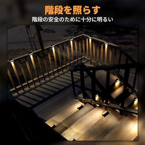 【暖色光、温かみのある雰囲気】:ソーラーデッキライトは夜間に綺麗に階段、玄関前、フェンス、ガーデンを照らし、暖かくてリラックスした気分を与え、快適な環境を作り出します。暖色系光を採用するソーラーライトはオレンジっぽい暖色ライトが精神的に最大程度でリラックスさせ、暖かい雰囲気や落ち着いた安心できる家を作り出します。また、垣根、デッキ、階段、テラス、ベランダ、庭や庭を照らすのに十分です。