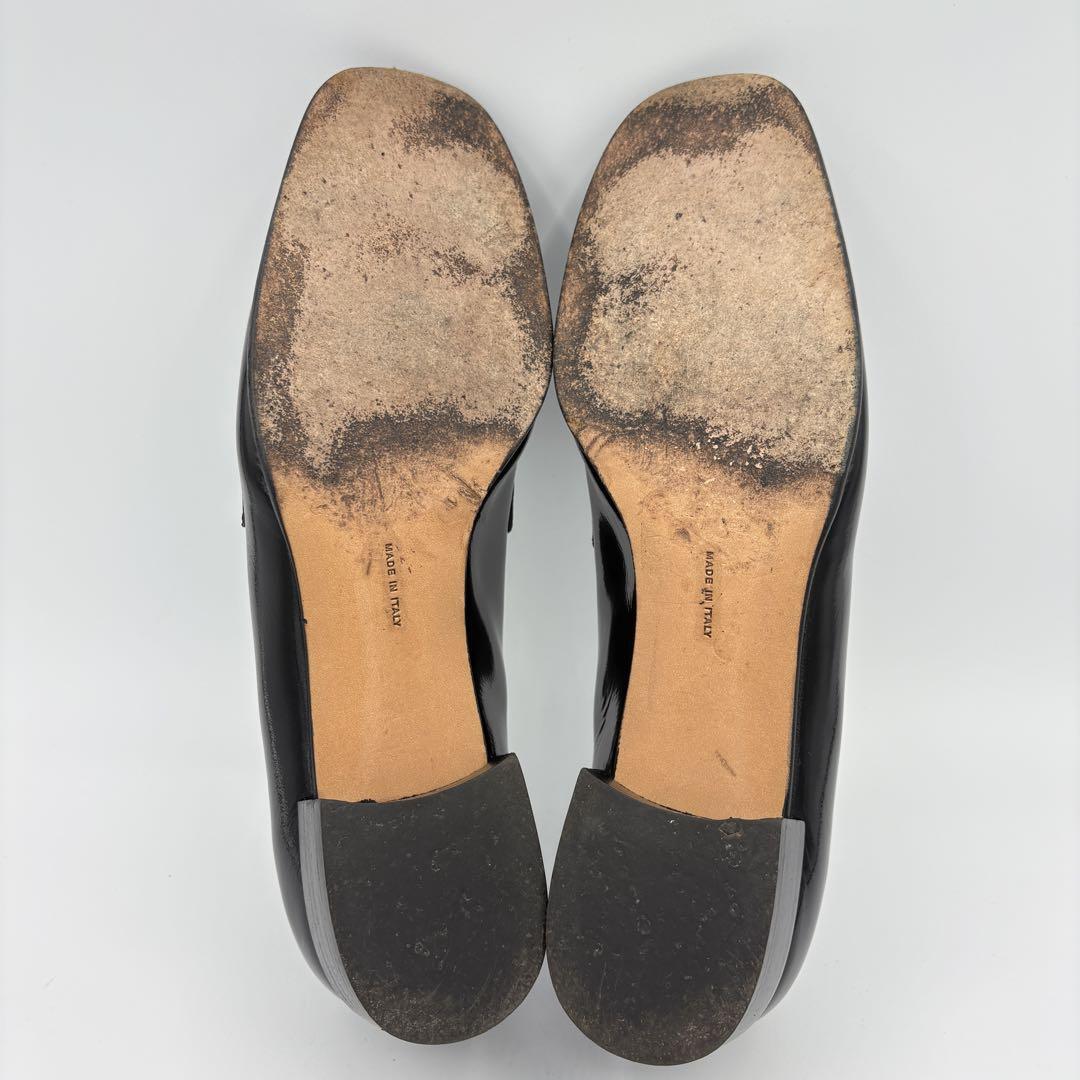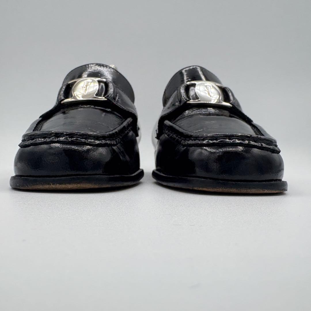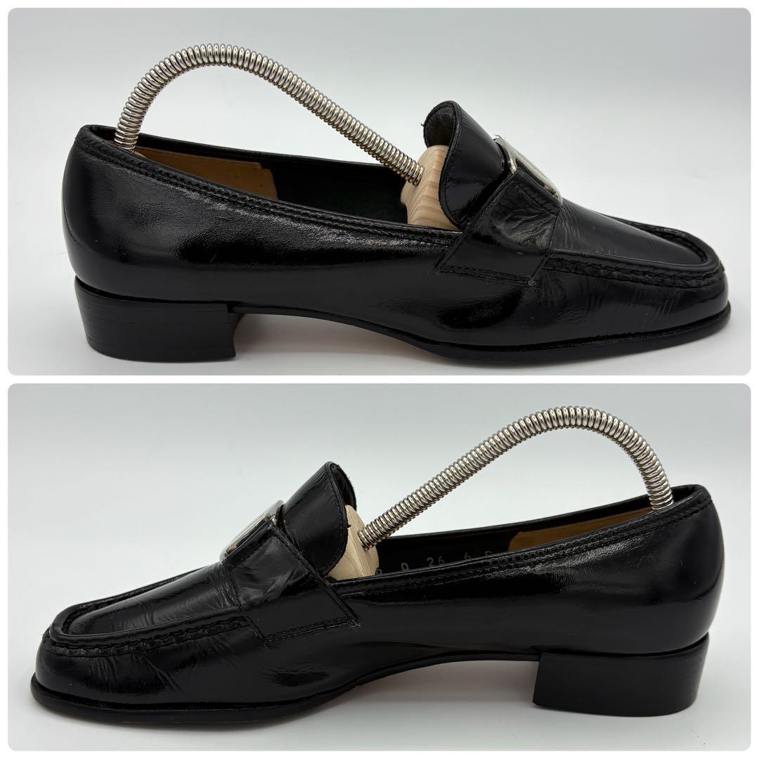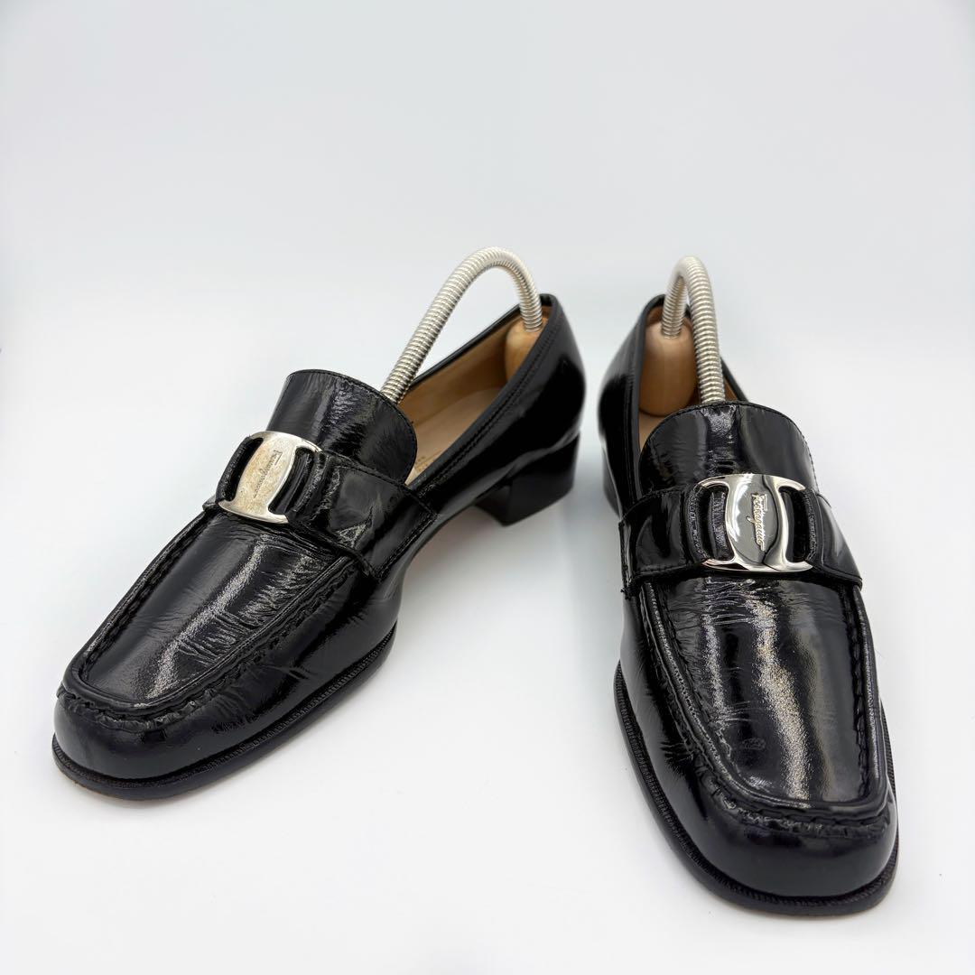 艶やかなガラスレザーが高級感を演出し、メタルプレートが足元を華やかに彩ります。
