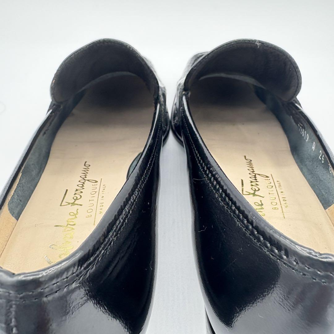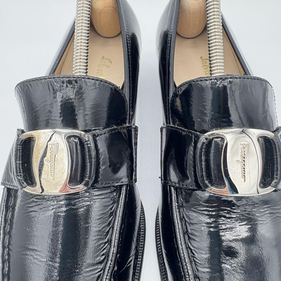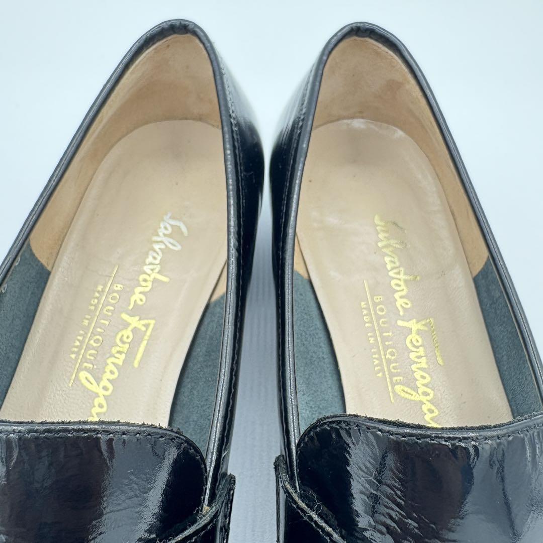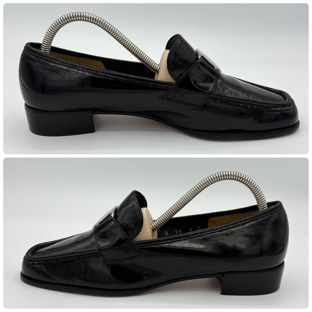 艶やかなガラスレザーが高級感を演出し、メタルプレートが足元を華やかに彩ります。