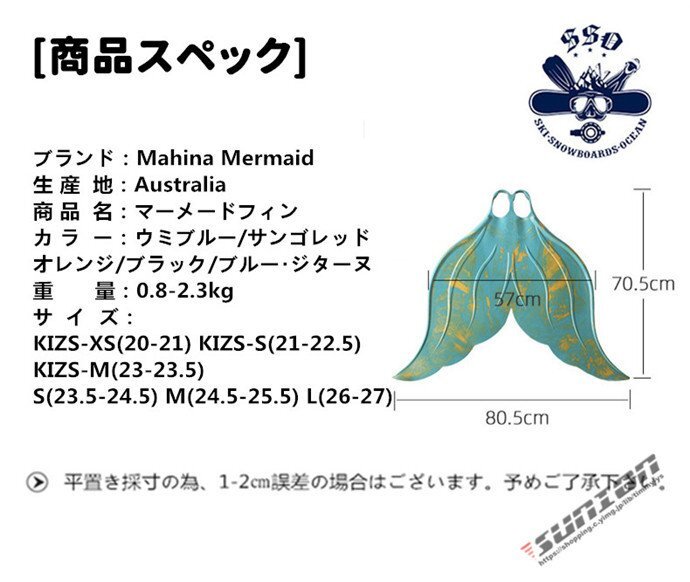 ■【商品特徴】◎◎マーメードやマーマンのように水中を容易にかつ滑らかに推進することができる最高ランクのモノフィン◎自然なキックのサイクルを妨げる事なく、理想のフィット感をキープし、トレーニングに最適なデザインに設計。◎傾斜ブレードは足に馴染み、自然な足の延長線で動かすことができます。■【商品スペック】◇ブランド:Mahina Mermaid◇生 産 地:Australia◇商 品 名:マーメードフィン◇カ ラ ー:ウミブルー/サンゴレッド◇オレンジ/ブラック/ブルー?ジターヌ◇重  量:0.8-2.3kg◇サ イ ズ:KIZS-XS(20-21) KIZS-S(21-22.5) KIZS-M(23-23.5)S(23.5-24.5) M(24.5-25.5) L(26-27)