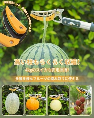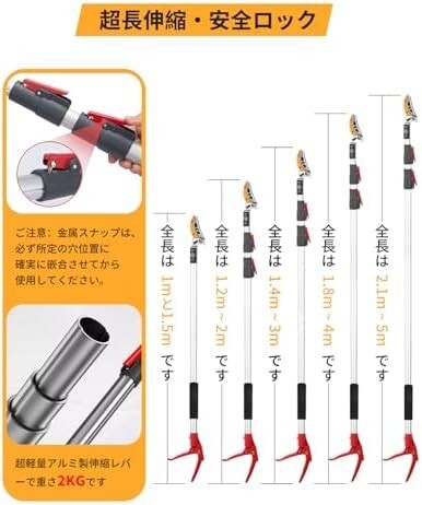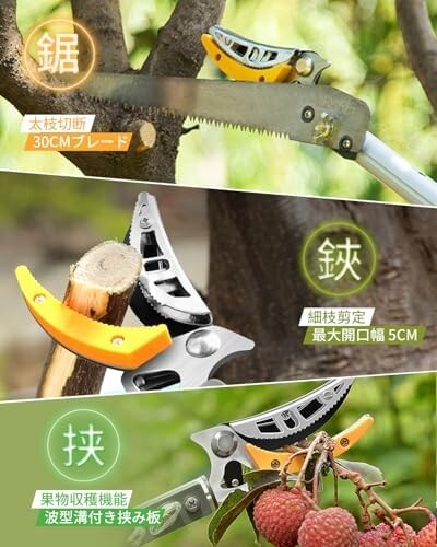 【多機能高枝切り鋏】:この高枝切りバサミは剪定・太枝切断・果実摘み取りの3機能を兼ね備えています。伸縮式設計で長さを簡単に調節でき、脚立や高所作業用具が不要、地上からでも高所の枝に届き、剪定作業の安全性と効率性を確保します。生垣の造型、低木の手入れ、果実の収穫など、様々な場面で活用できます。