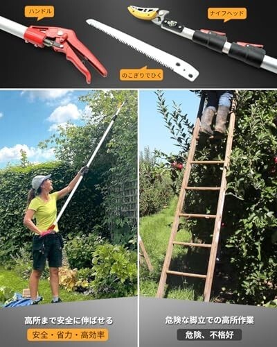 • 【製品仕様】 セット内容:伸縮ポール x 1本、替え刃 x 2枚、鋸刃x 1枚 / 長さ:1.4~3m(伸縮可能)/ 重量:1.3kg / 最大切断可能直径:1.5cm / 鋸刃長さ:30cm / 刃材質:SK9高炭素鋼 / ポール材質:アルミ (注意:刃部に安全ロック機能付き。使用後は必ずロックしてください)