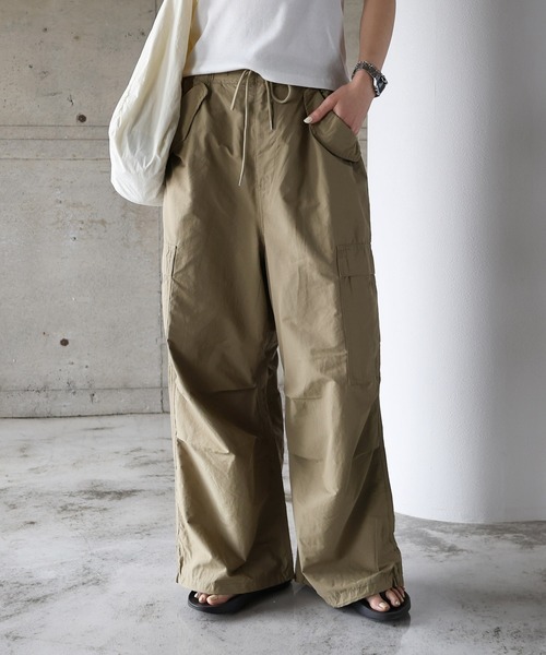 キーワード:カーゴパンツ レディース ウエストゴム ストレート ハイウエスト フルレングス ワイドパンツ 無地