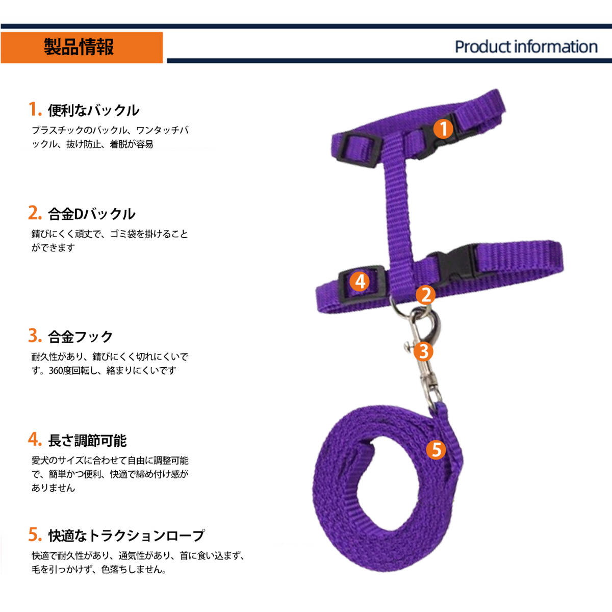 | 製品について | 【使いやすい】ワンタッチバックルで、着脱が簡単です。 【快適通気性】柔らかい素材で、通気性が良く、快適な着用感があります。 【耐久性】高品質な素材で作られており、かみ傷に強く、破損しにくいです。 【楽な引き】一体型デザインで、手触りがよく、引っ張るのが楽です。 【安全確実】工字形状のデザインで、クリップ付きフックが付属しており、非常に安全です。 【長時間の着用でも締め付けがありません】均等に力がかかるため、調整可能なバックルが付いており、首を締め付けずに喉を傷つけません。 |
