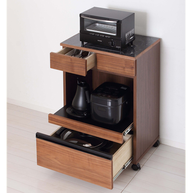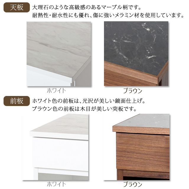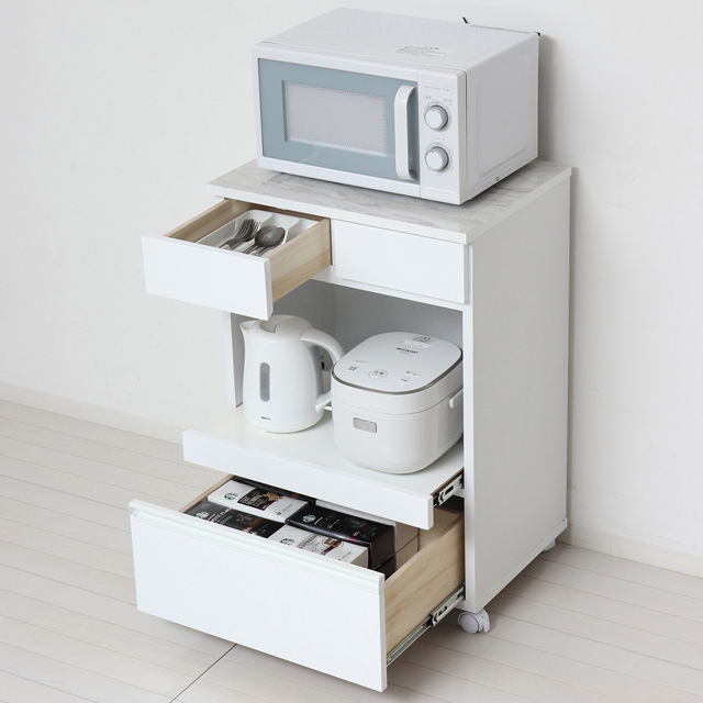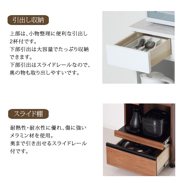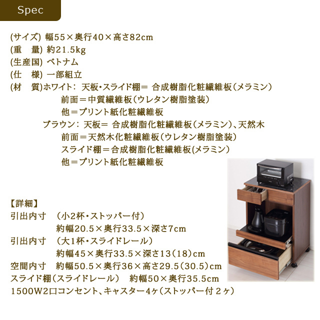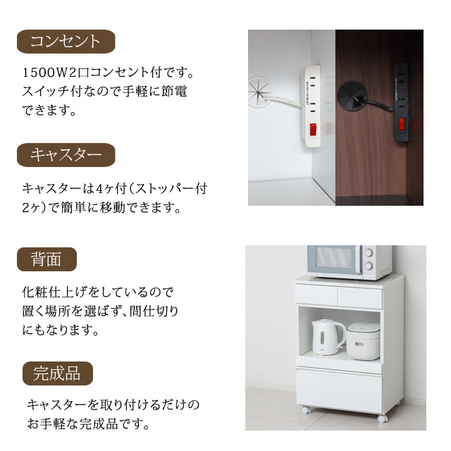 商品説明 | コンパクト レンジワゴン ホワイト 落札後、最初の連絡で配達伝票に記載する電話番号をお尋ねします 低め設計で場所をとらないコンパクトサイズのレンジワゴン! ●天板は大理石のような高級感のあるマーブル柄です。耐熱性・耐水性に優れ、傷に強いメラミン材を使用しています。お手入れも簡単です。 ●上部引出し(2杯)は、小物整理に便利です。 ●シンプルでスタイリッシュなスチール取手です。 ●1500W2口コンセント付。スイッチ付きなので手軽に節電できます。 ●スライド棚は、耐熱性・耐水性に優れ、傷に強いメラミン材を使用。また奥まで引き出せるスライドレール付です。 ●下部引出しは、大容量でたっぷり収納できます。スライドレールなので奥の物も取り出しやすくなっています。 ●キャスターは4ヶ付(ストッパー付2ヶ)で簡単に移動できます。 ●背面は化粧仕上げをしているので置く場所を選ばず、間仕切りにもなります。 ●キャスターを取り付けるだけのお手軽な完成品です。 ●明るく清潔感のあるホワイトと、木目がきれいなブラウンの2色展開です。 サイズ・容量 【商品サイズ】約 幅55×奥行40×高さ82cm 【重 量】約 21.5kg 【梱包サイズ】約 61.5×46×82cm(約189.5cm) 【梱包重量】約23.5kg 規格 【材 質(ホワイト)】 天板・スライド棚=合成樹脂化粧繊維板(メラミン)、前面=中質繊維板(ウレタン樹脂塗装)、他=プリント紙化粧繊維板 【材 質(ブラウン)】 天板=合成樹脂化粧繊維板(メラミン)、天然木、前面=天然木化粧繊維板(ウレタン樹脂塗装)、スライド棚=合成樹脂化粧繊維板(メラミン)、他=プリント紙化粧繊維板 【仕 様】一部組立 【生産国】ベトナム 明るく清潔感のあるホワイト専用ページです、木目がきれいなブラウンも有りますが別ベージとなってます。 ●ホワイト色の前板は光沢が美しい鏡面仕上げ。ブラウン色の前板は木目が美しい突板です。 (1枚目の写真は取扱いカラー全色を載せていますが、専用ページカラー以外の画像は参考として下さい サイズの写真はブラウンを使っていますが、画像は参考として下さい) カタログ価格42000円 |