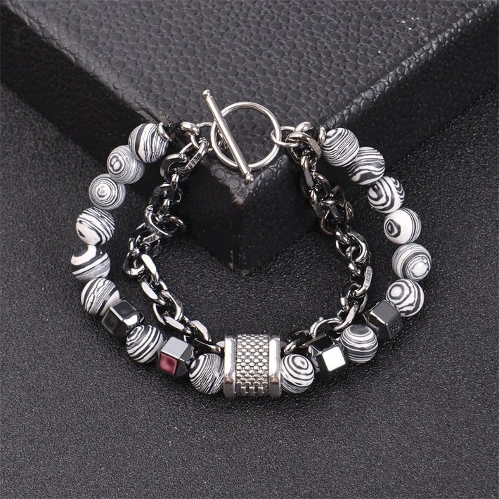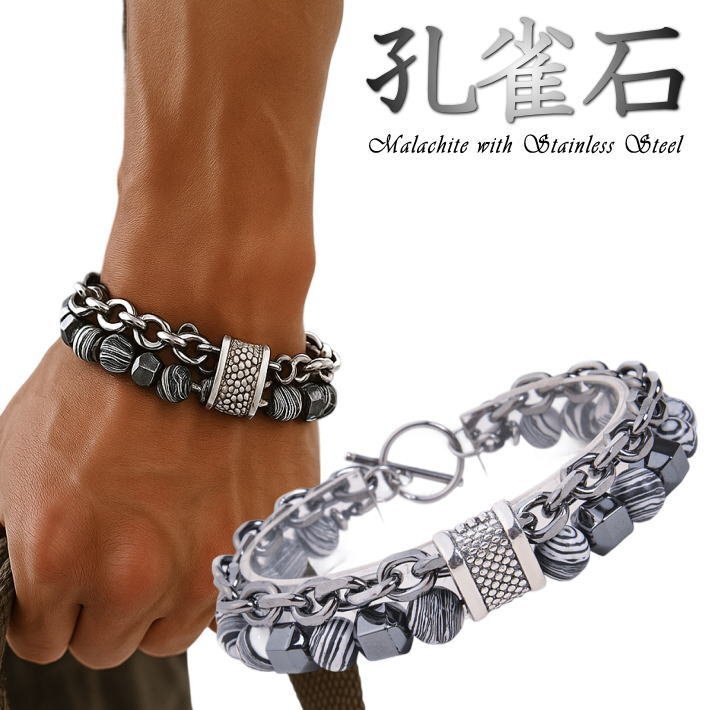 ステンレス製チェーンと天然孔雀石(マラカイト)を組み合わせたブレスレット。
