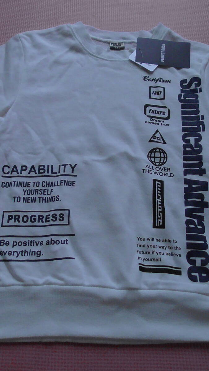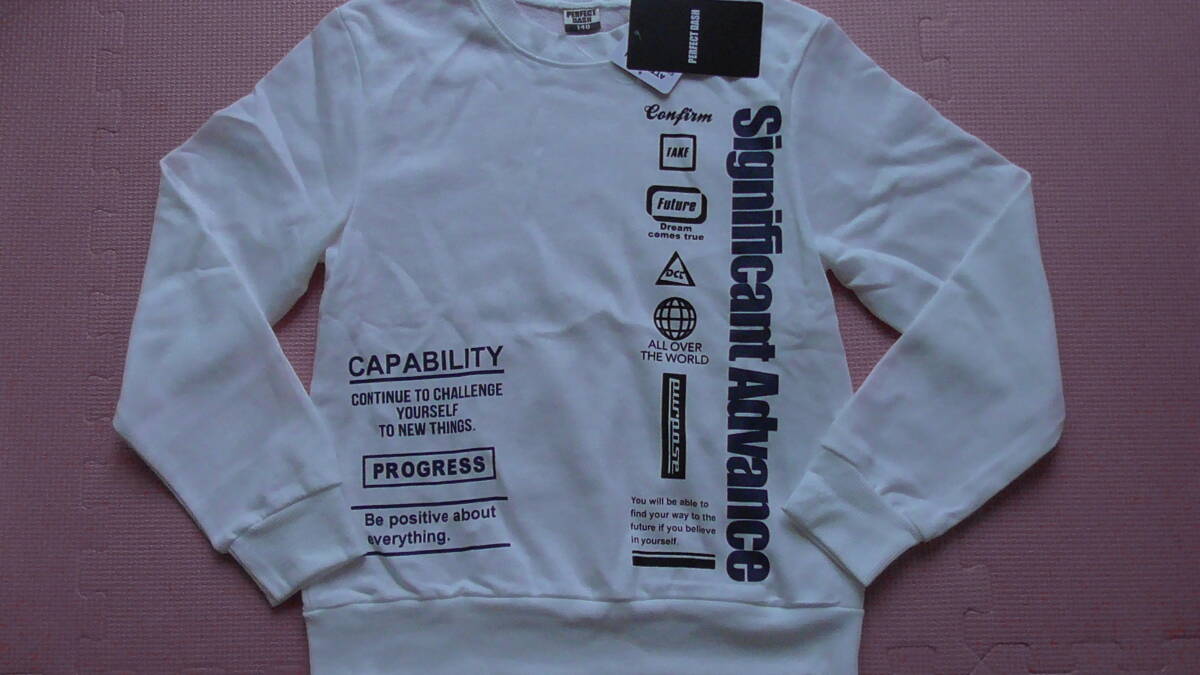 新品 140 長袖トレーナー 白色 縦書き英字ロゴプリント 図形 インターネットアイコン 地球マーク 裏毛 小学生 男の子 秋物 130〜 送料無料