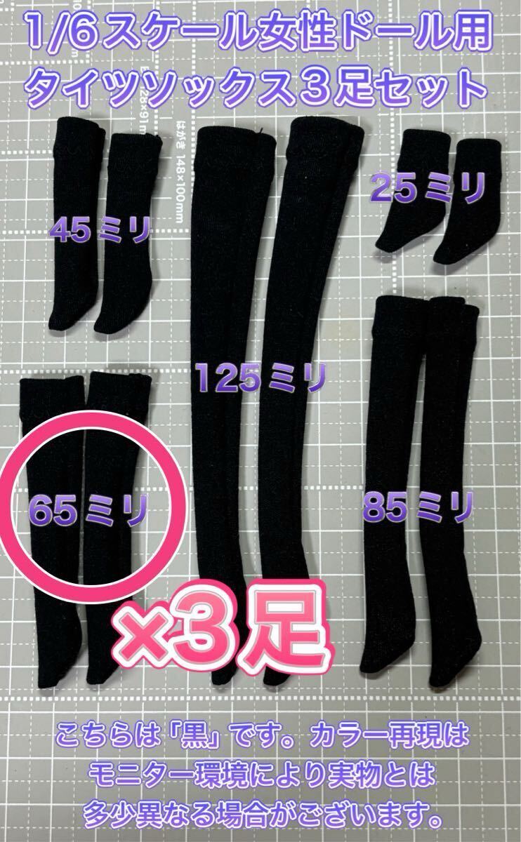 リカちゃん、ジェニー、ネオブライス、アイシードール 、オビツ27女性ボディ、ハッシュタグボディなどが着用出来る、薄手の化繊ソックス長さ違い、平置きで約65ミリの3足セットです。