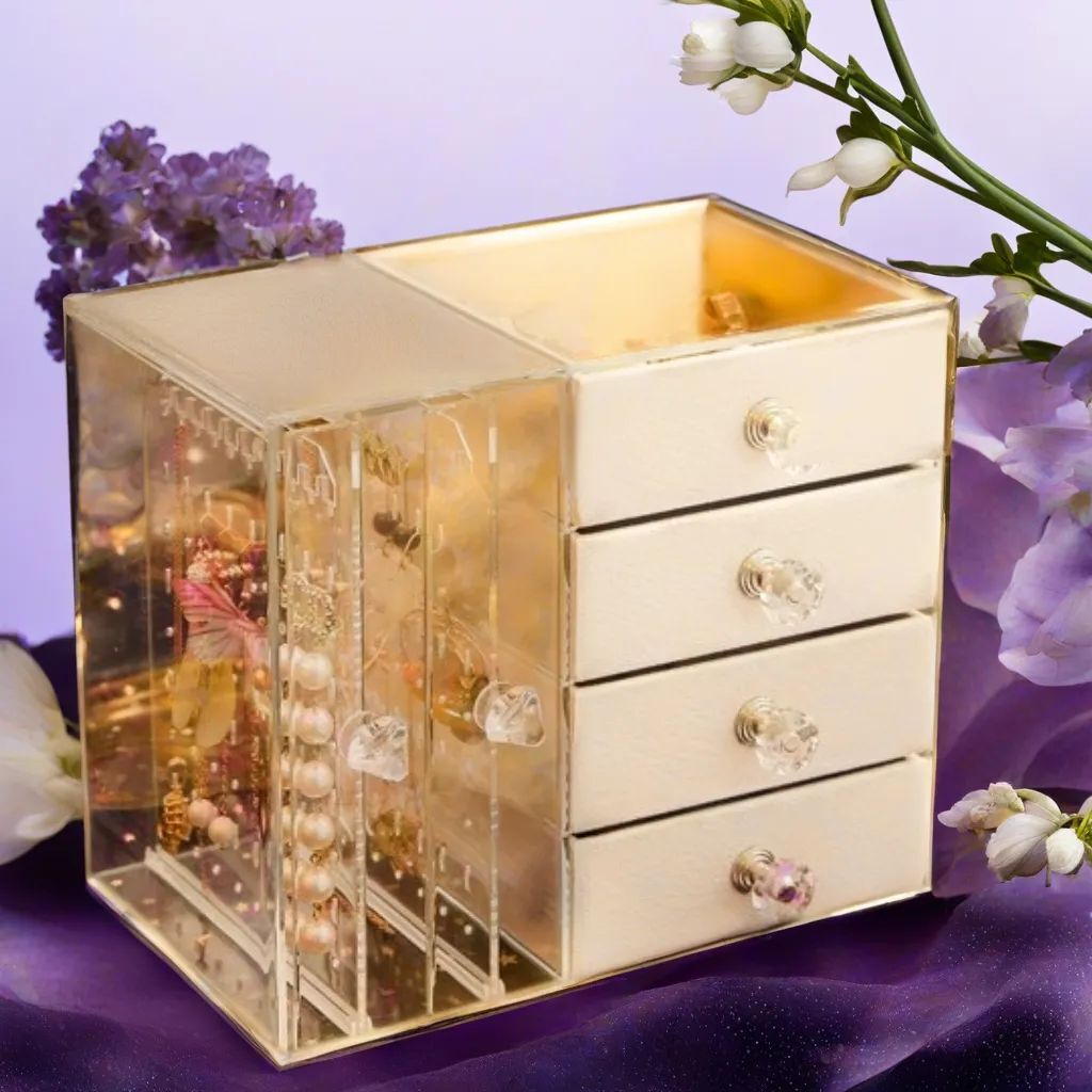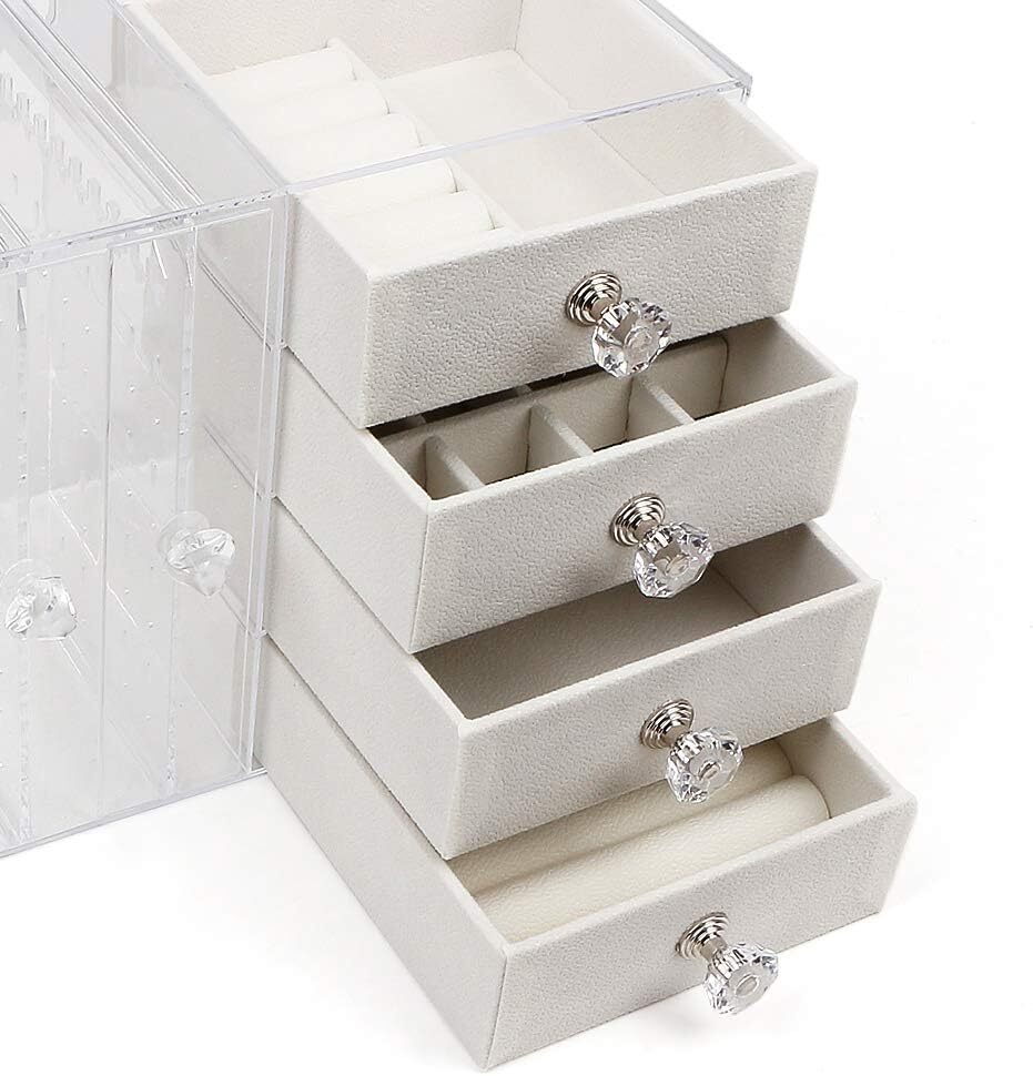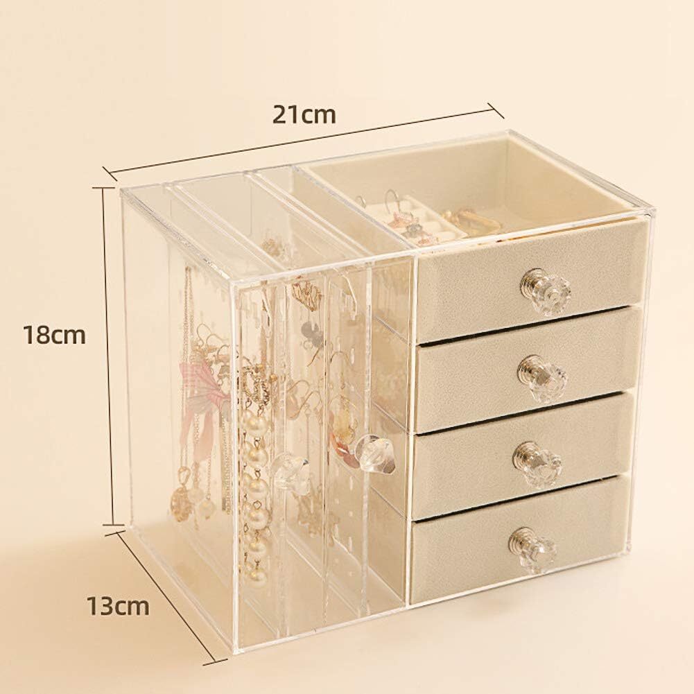 多層構造となっており、左には透明のピアススタンド、縦型の引き出しは動きやすく取り出すことがとても便利です。ホコリや傷から貴重なジュエリーをよく保管します。右は4つの引き出しがあり、小分けの仕切りがたくさんあるので、内にはベルベット生地で装飾して、柔らかくネックレス、イヤリング、ピアス、指輪、ブレスレットや腕時計などの貴重な物はよく保護します。