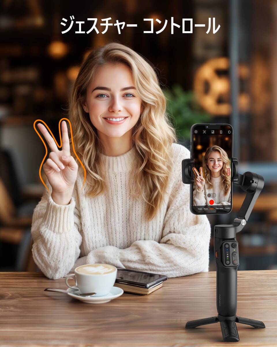 11時間駆動 着脱式リモコン&外部三脚付 専用アプリで顔追跡 3軸スマホジンバル ジェスチャー操作 美顔 ジンバル 手ブレ補正 ス