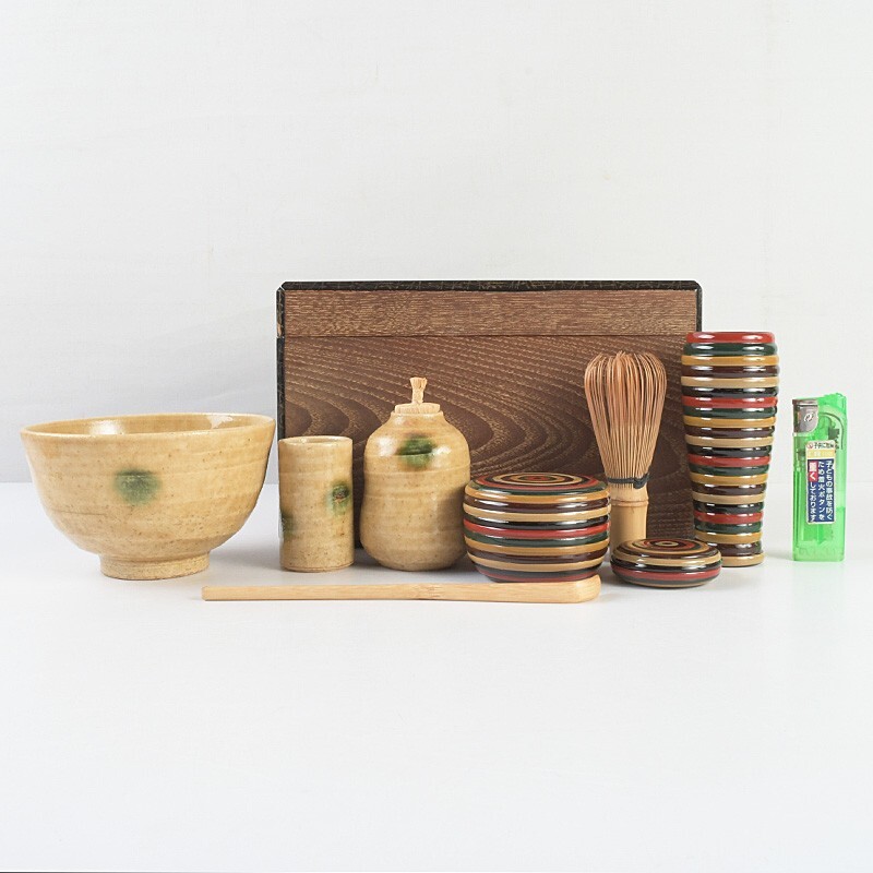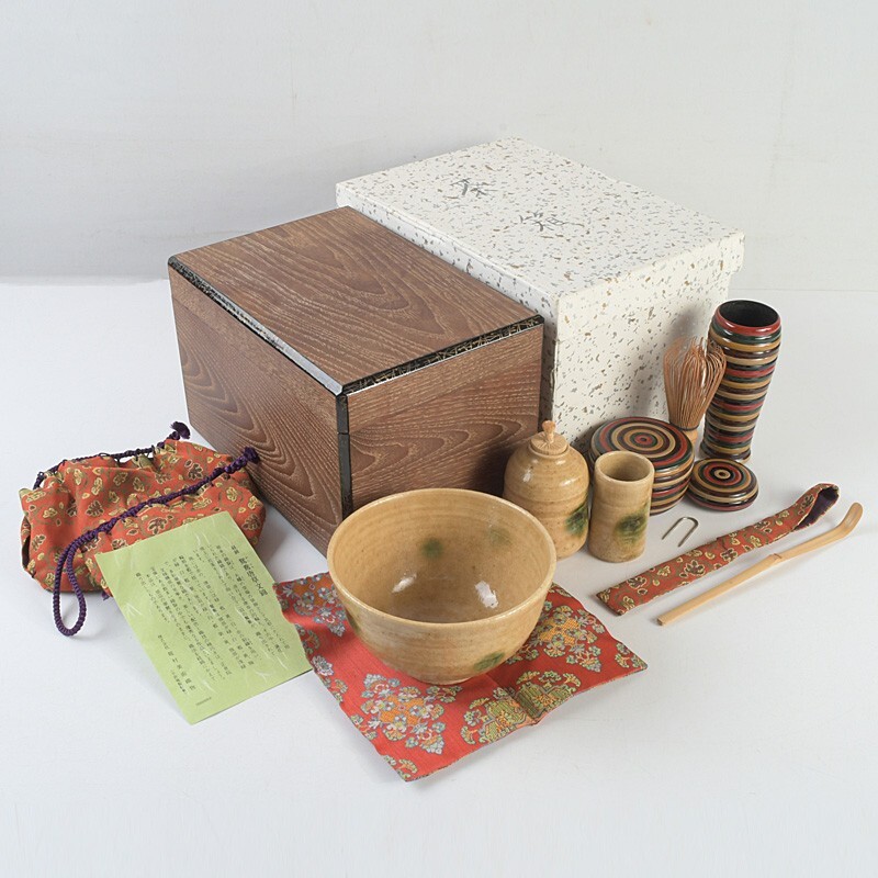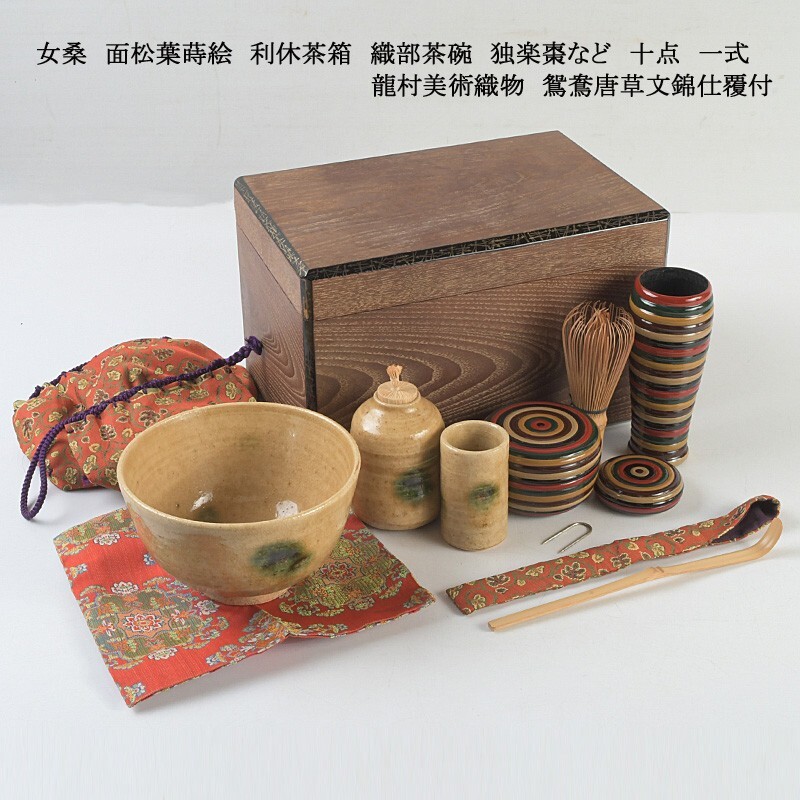 茶道具 女桑 面松葉蒔絵 利休茶箱 織部茶碗 独楽棗など 十点 一式 龍村美術織物 鴛鴦唐草文錦仕覆付 MVRL