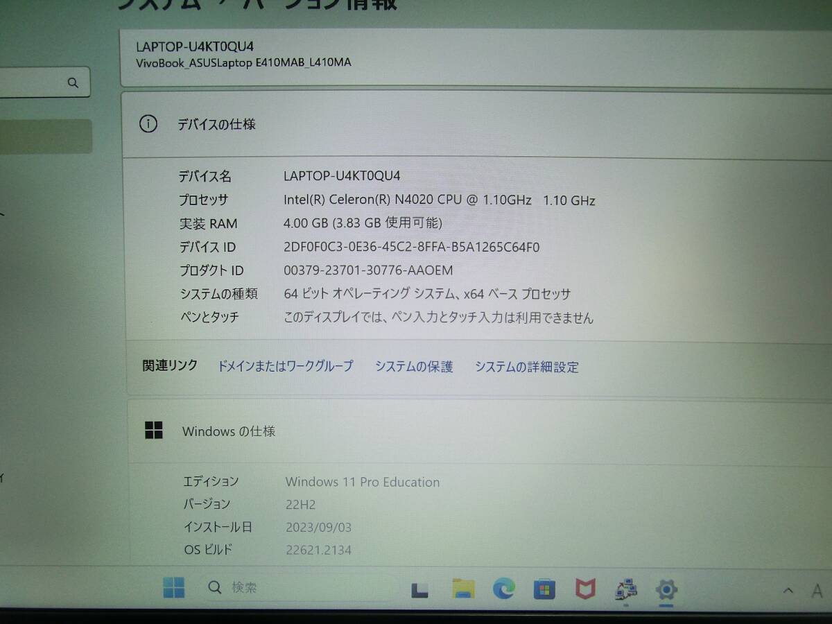 【中古】ASUS L410MA(バッテリー不調)/Intel Celeron N4020/メモリ4GB/60GB SSD/Windows 11 Pro/管:NPC2508-849