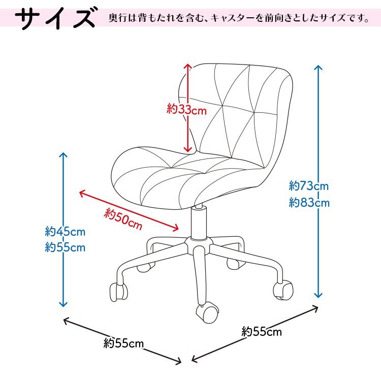 ほどよい温かみと深みのあるコーデュロイ素材と色味が お部屋の雰囲気をグンと高めます♪ コンパクトなサイズ感で圧迫を感じにくいデザイン。 シンプルでモダンな雰囲気を醸し出すリビングやオフィス、 カフェなど幅広くご使用いただけます! 昇降レバーで簡単に高さ調節可能! また、丈夫なスチール脚で安心して座れます。 【商品仕様】 カラー:ミルキーベージュ 本体サイズ(約):幅55cm×奥行55cm×高さ73~83cm(座面高45~55cm) 座面積(約):50cm 背面の高さ(約):33cm 素材:コーデュロイ生地、スチール 他 その他:360℃回転、高さ調節、キャスター付 【注意事項】 ・お客様組立の商品です。 ・商品は、モニターによって色合いが異なって見える場合があります。 ・仕様/デザインは改良のため予告なく変更することがあります。 |