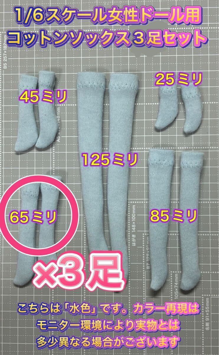 リカちゃん、ジェニー、ネオブライス、アイシードール 、オビツ27女性ボディ、ハッシュタグボディなどが着用出来る、ごくシンプルな綿のソックス長さ違い、平置きで約65ミリの3足セットです。
