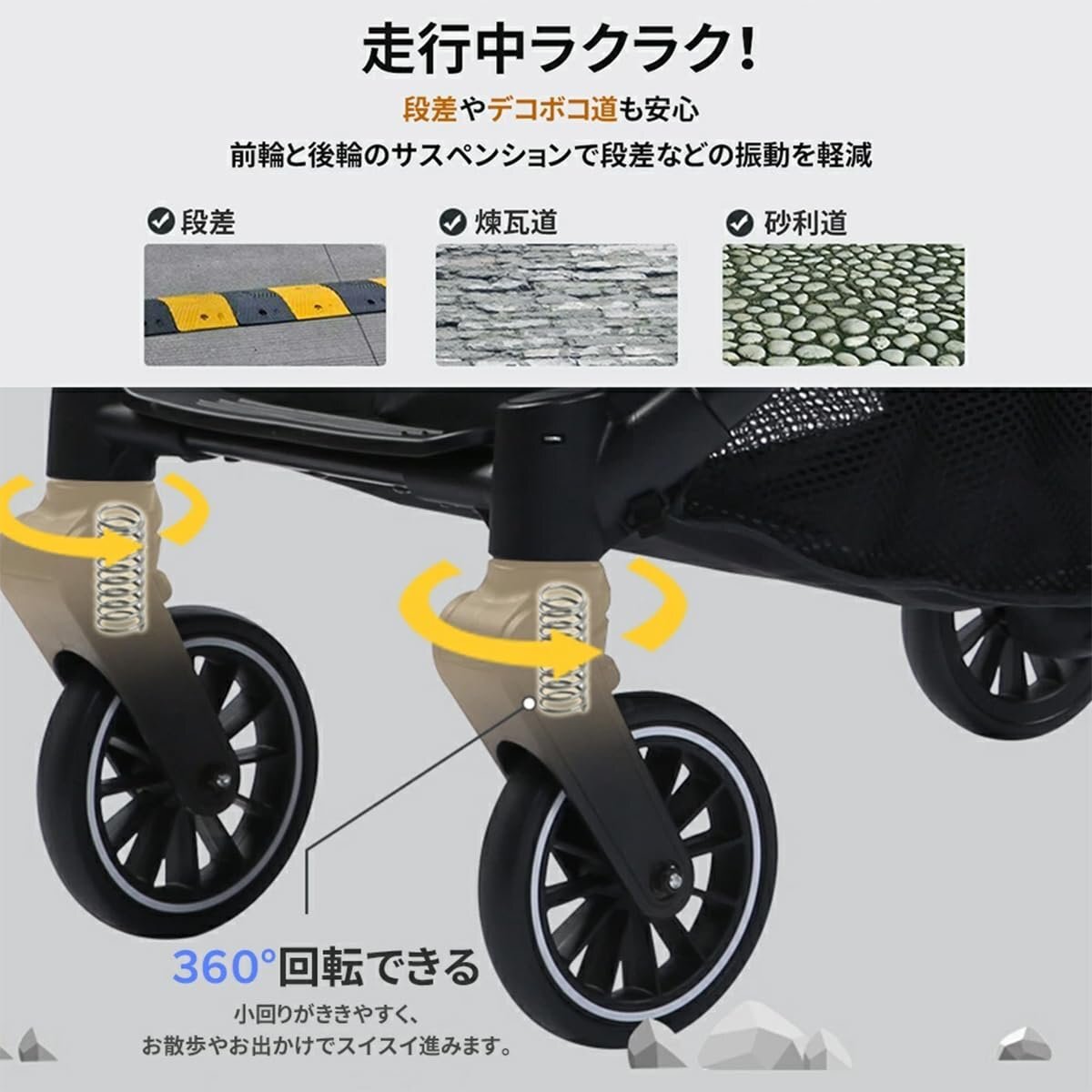 【前輪サスペンション搭載】走行時の衝撃をしっかりと吸収し、段差も乗り越えやすく、快適な乗り心地を提供します。