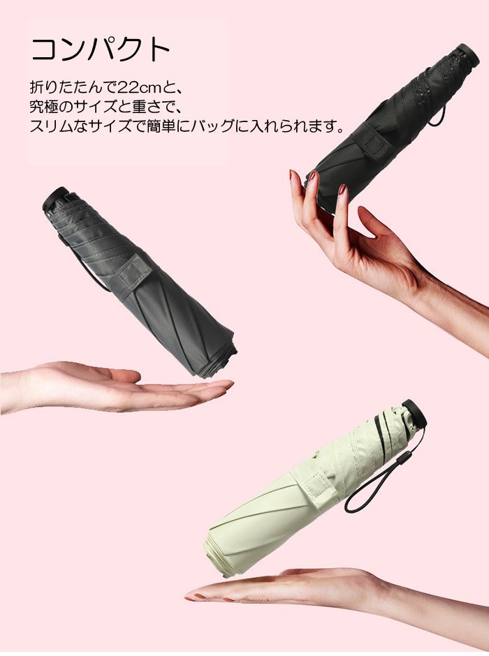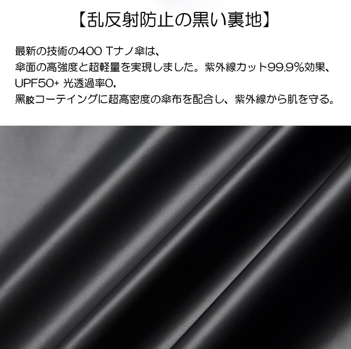 商品説明 | ★1.【UVカット*完全遮光】 強い日差しをシャットダウン 厳しい日差しに負けない生地で 肌や目へのダメージとなる太陽光・紫外線を99%以上遮ります! 最高水準のUPF50+だから安心◎ ★2.【乱反射防止の黒い裏地】最新の技術の400 Tナノ傘は、 傘面の高強度と超軽量を実現しました。紫外線カット99.9%効果、 UPF50+ 光透過率0, 〓グル?コーテイングに超高密度の傘布を配合し、紫外線から肌を守る。 ★130gの超軽量、毎日の通勤などに持ち歩いても、 負担をかけずにいつでも簡単に紫外線対策ができます。 ★【コンパクト】折りたたんで22cmと、究極のサイズと重さで、 スリムなサイズで簡単にバッグに入れられます。 ★【晴雨兼用】紫外線も急な雨に対応したいけど、荷物を増やしたくないですよね。 この晴雨兼用傘があれば快適な毎日を過ごせます♪ |