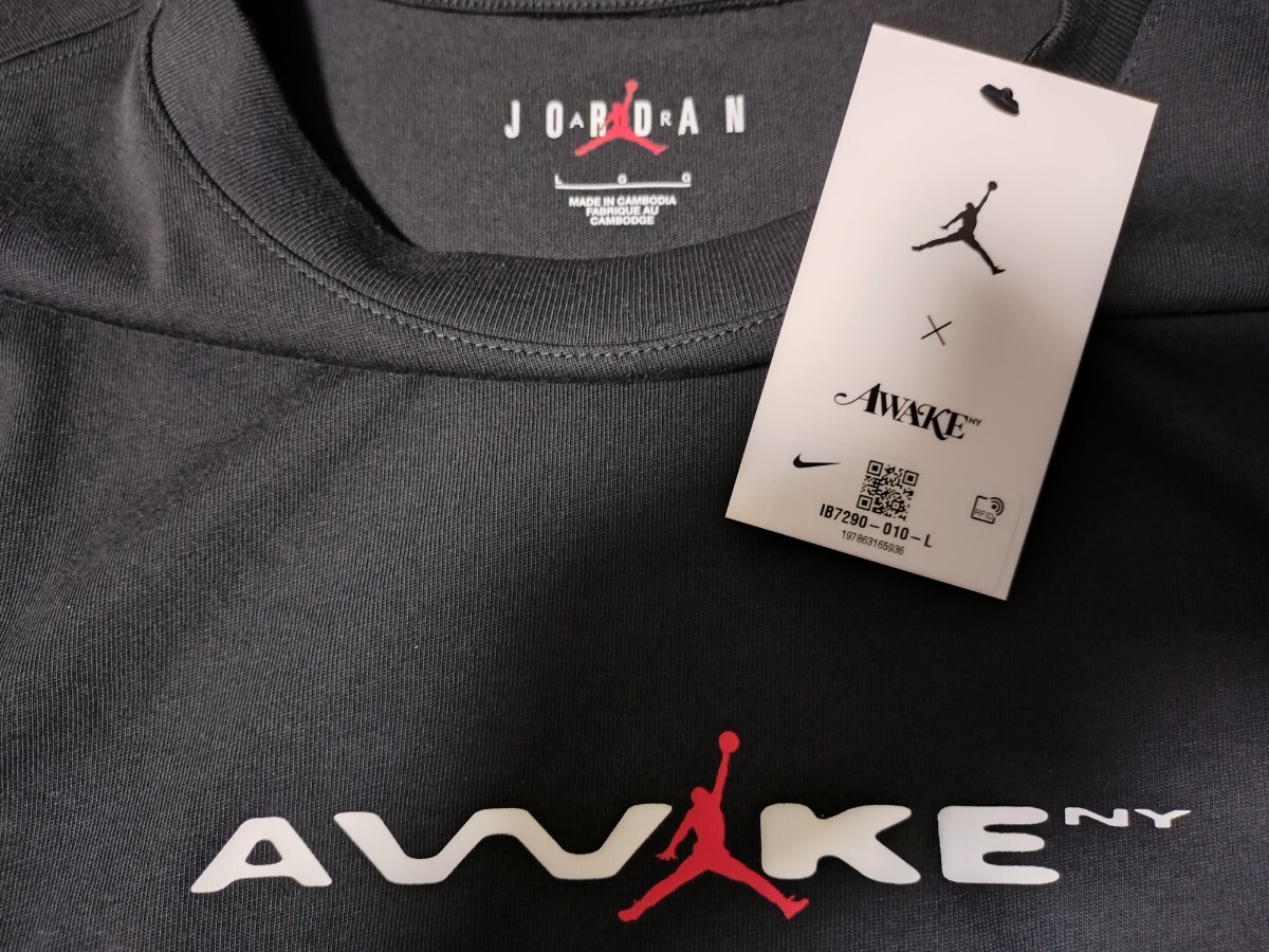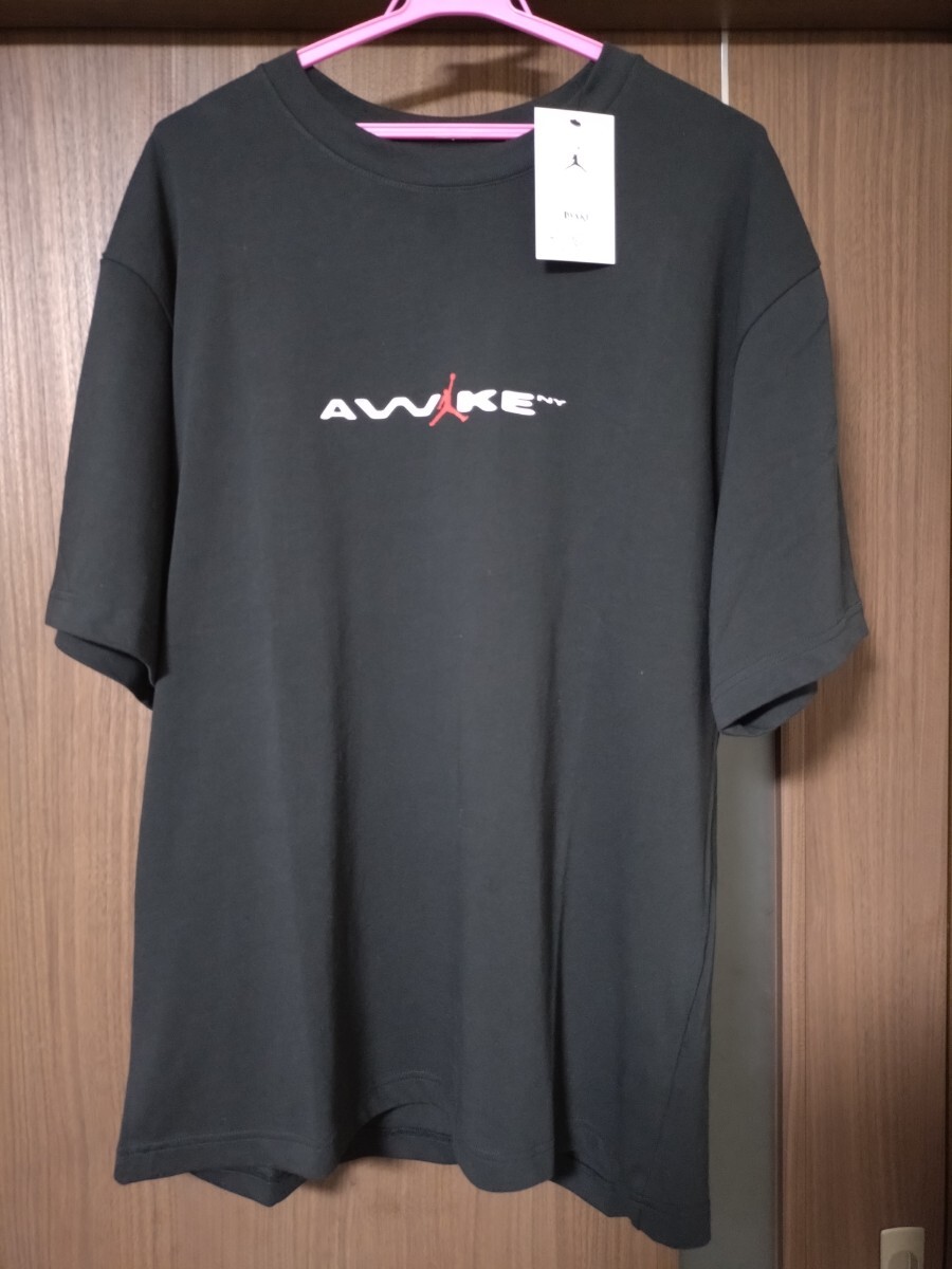 「AWAKE NY × Jordan 5 Borough Tee」新品です。色は黒、サイズはUSサイズのL(肩幅56・身幅59・着丈77cm)です。国内正規品でタグも付いたままです。商品は入金確認後に出品者負担で郵送します。