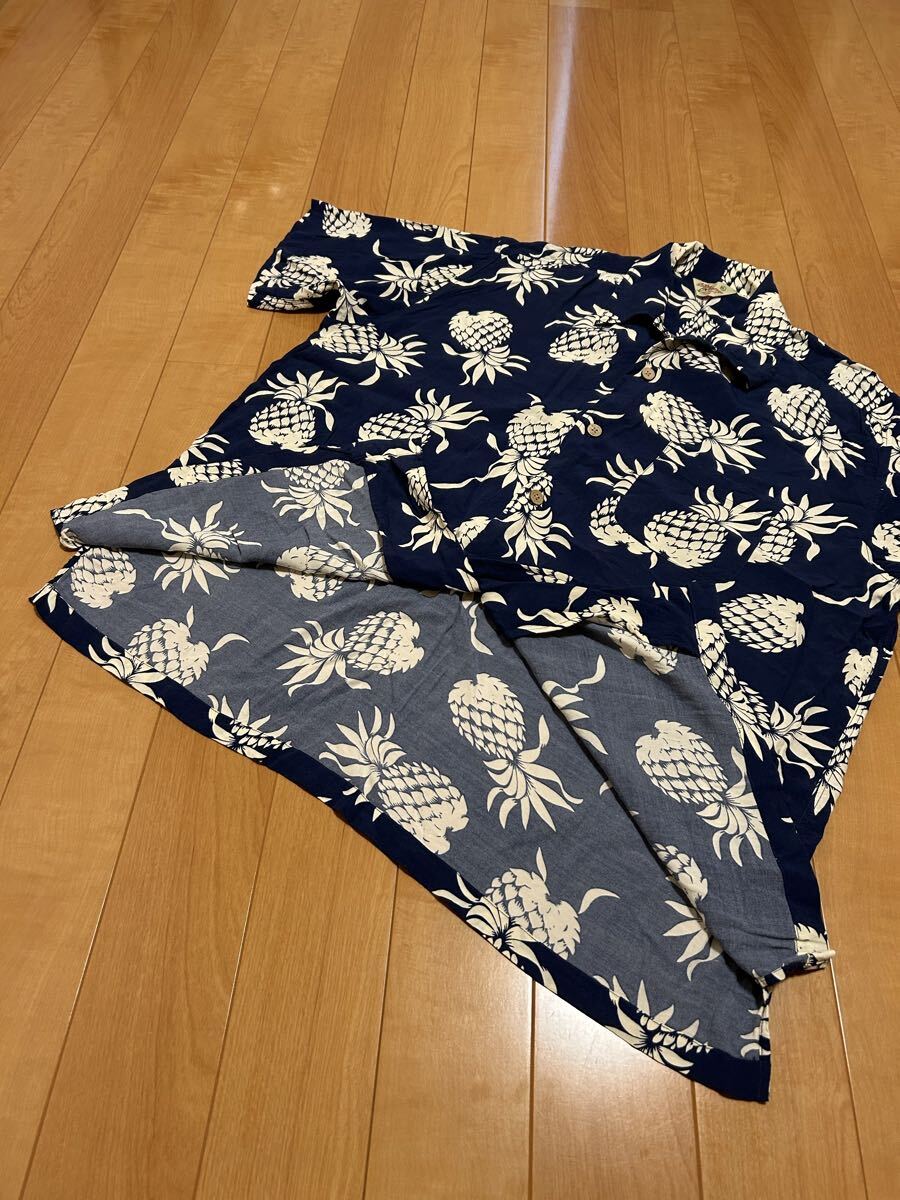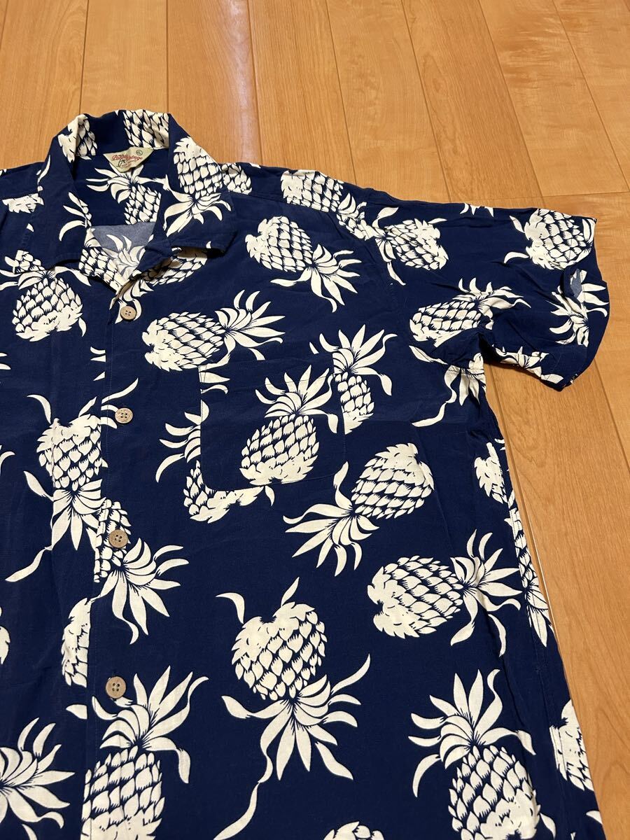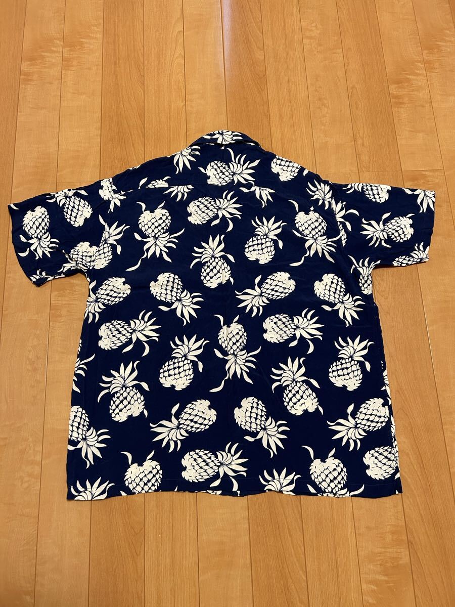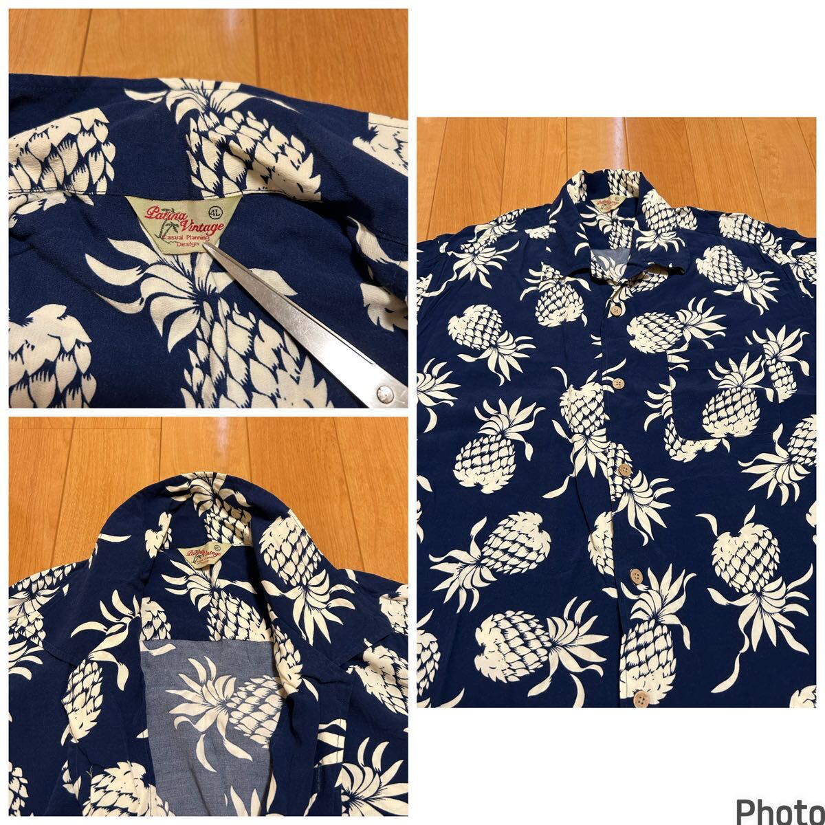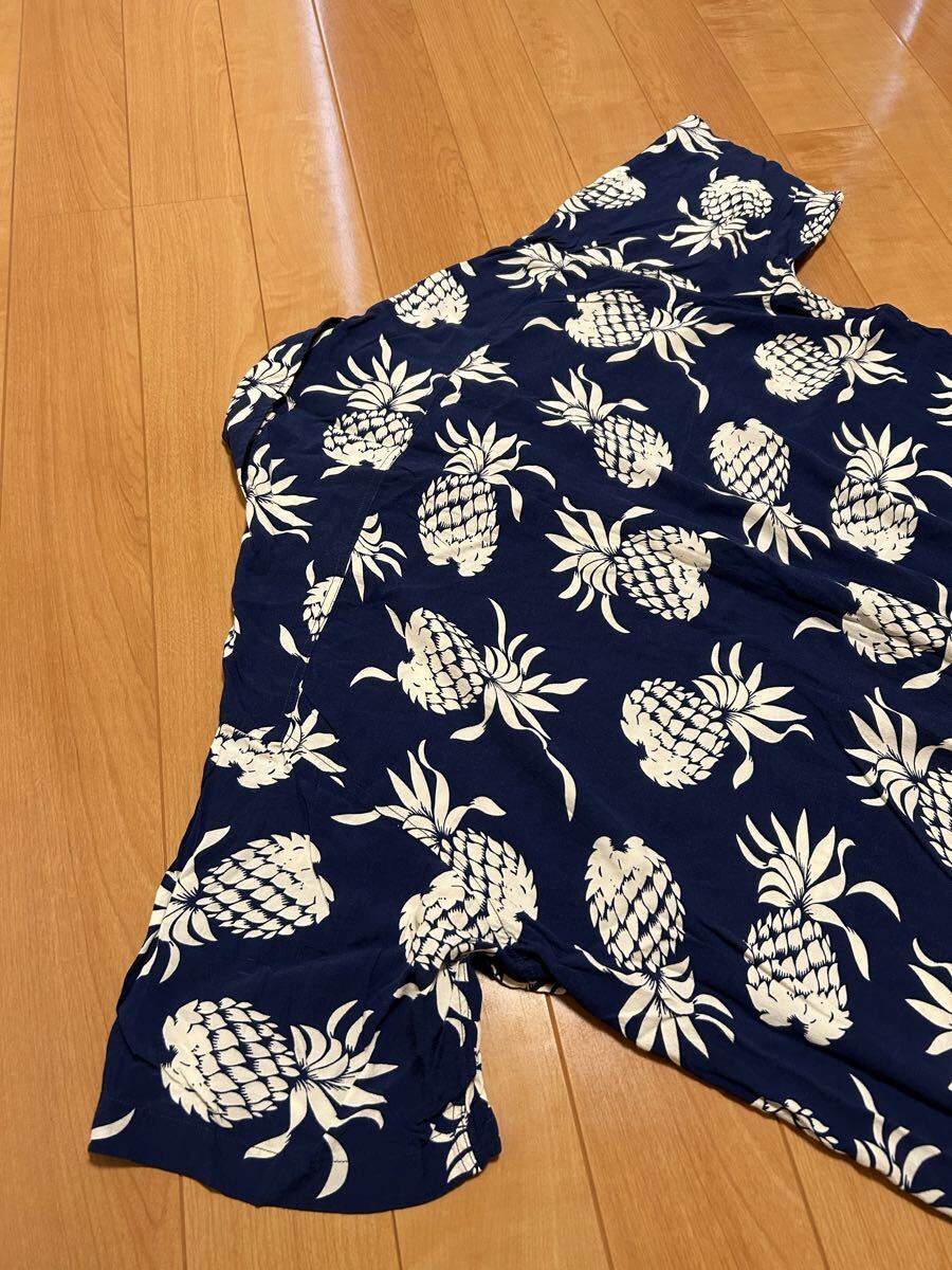 良品☆PATINA VINTAGE メンズ希少サイズ4L 縮緬レーヨン.半袖開襟アロハシャツ ビンテージ調パイナップル総柄 濃紺ネイビー!ココナッツ釦