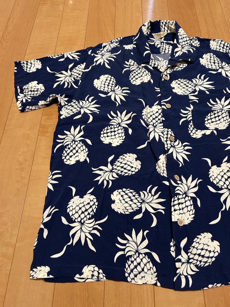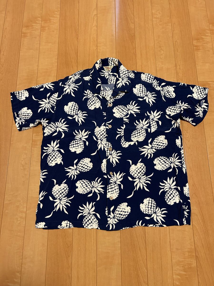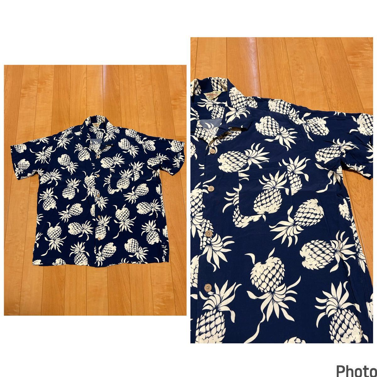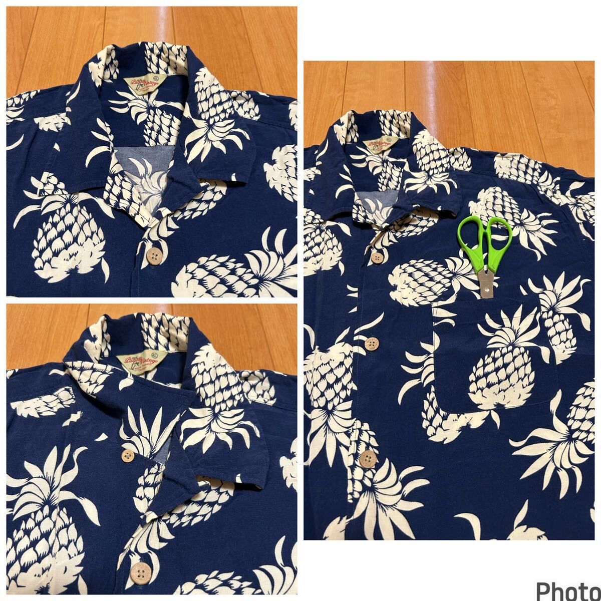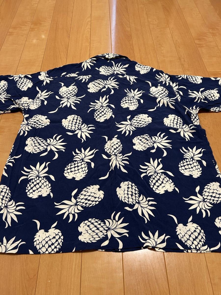 良品☆PATINA VINTAGE メンズ希少サイズ4L 縮緬レーヨン.半袖開襟アロハシャツ ビンテージ調パイナップル総柄 濃紺ネイビー!ココナッツ釦