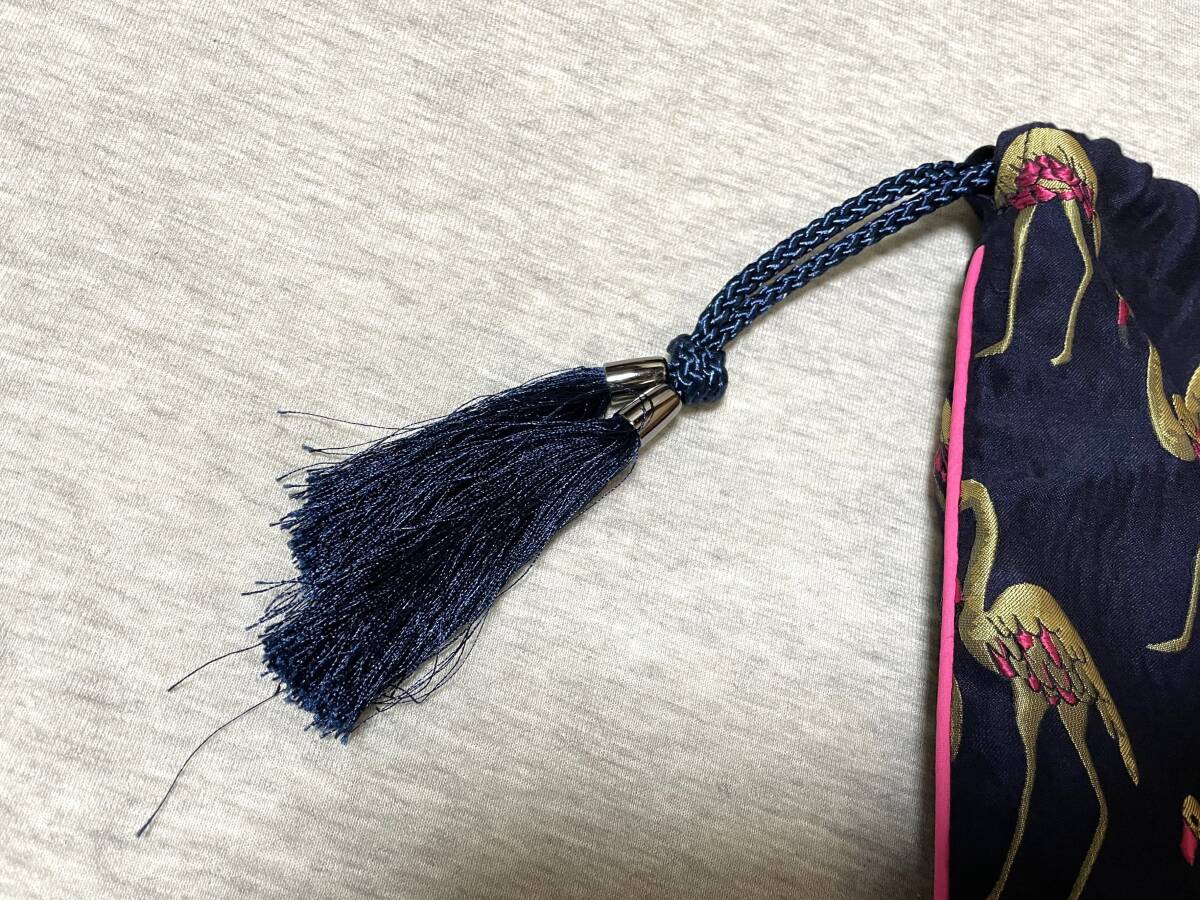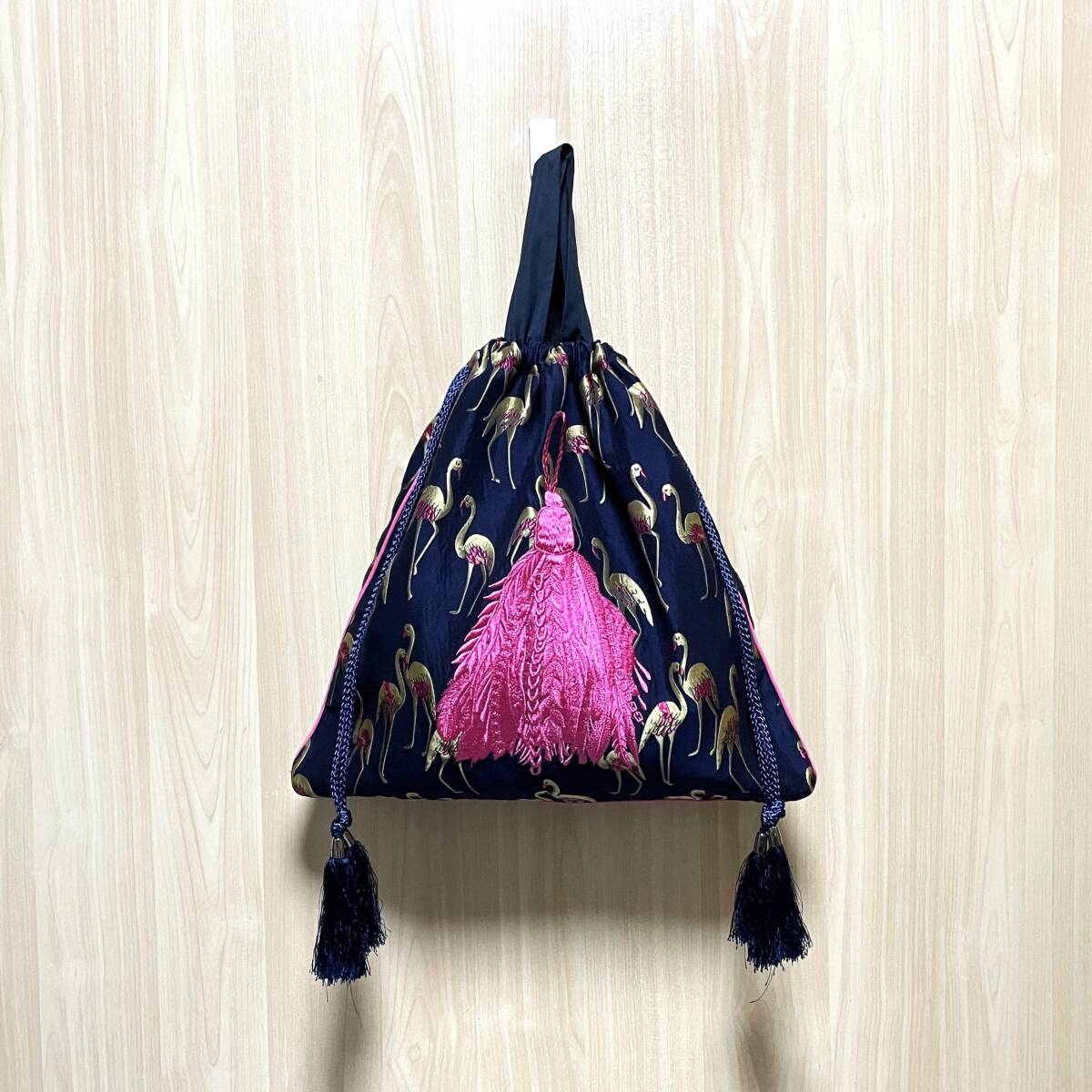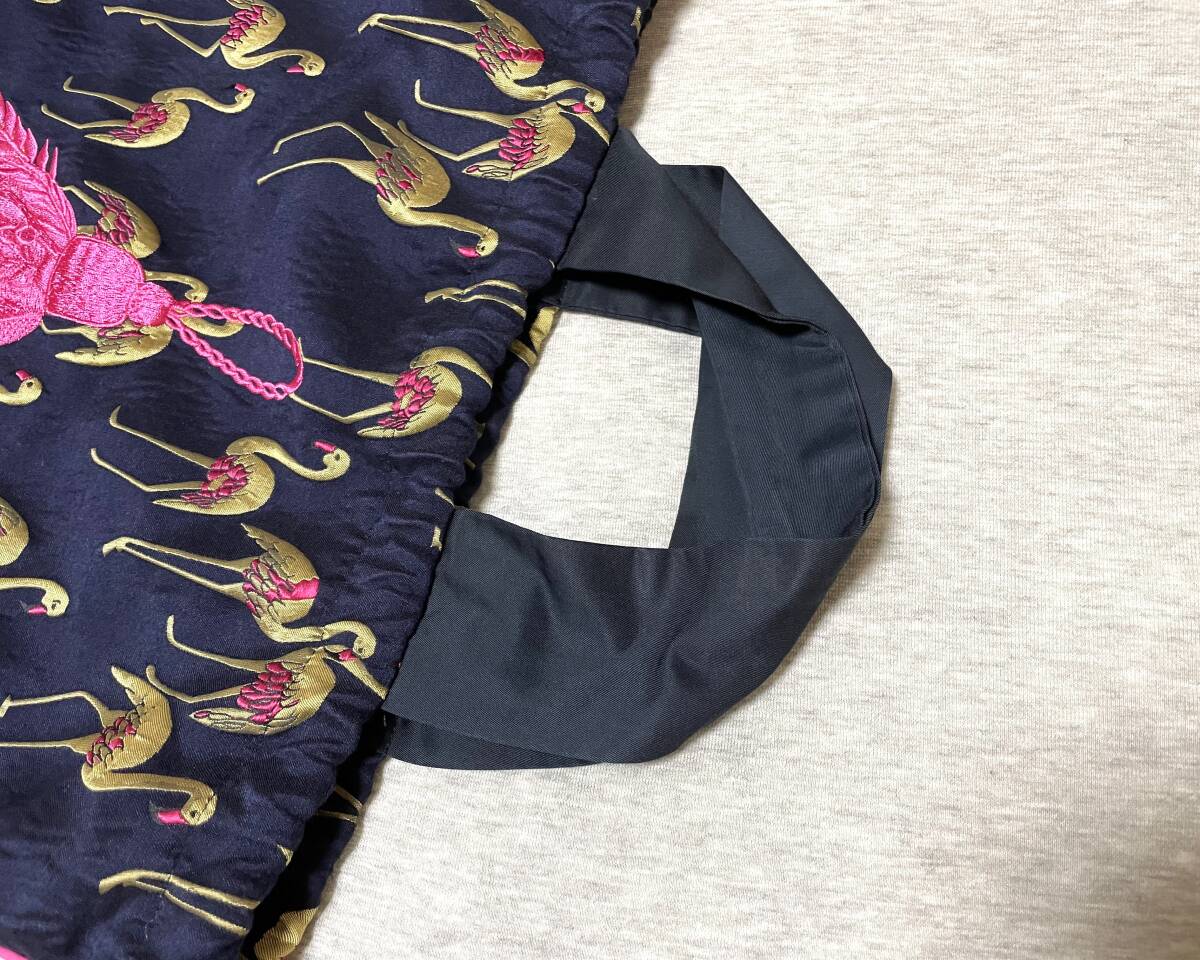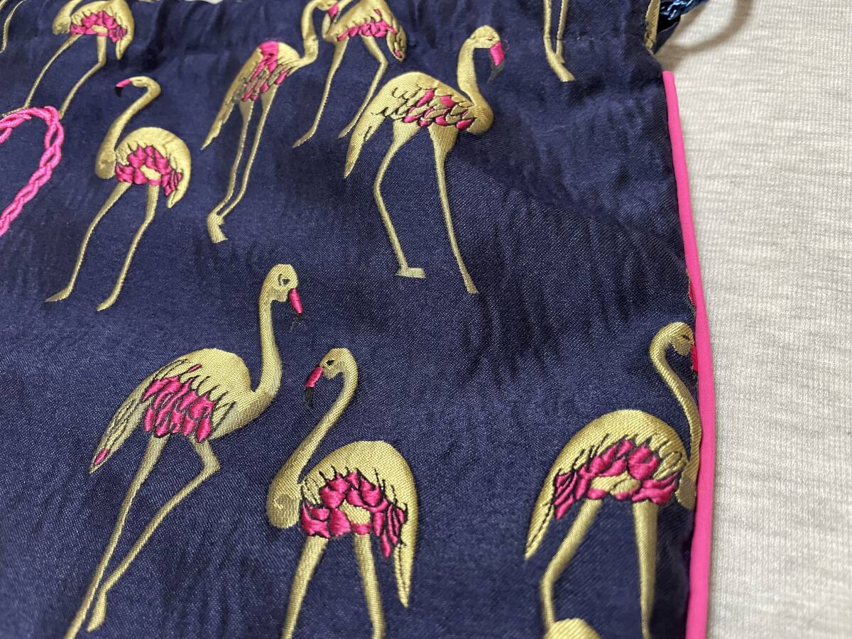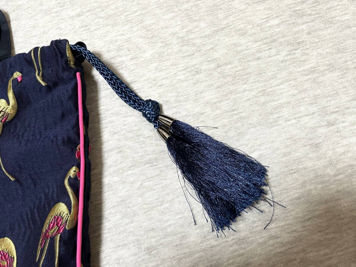 本体外側に使われている生地は濃い紺色で(黒身も見えるような感じの色目です)、フラミンゴ柄はゴールドやルビー色と言った感じの濃い目なピンクが使われており、タッセル柄の刺繍部分も同様な感じのピンク、外周部のパイピングに使われている生地も同様な感じのピンクで、ハンドルに使われている生地は黒、開口部周囲に通されている丸紐は紺色で、被されている金具部分はシルバー、内側に使われている生地は黒です。