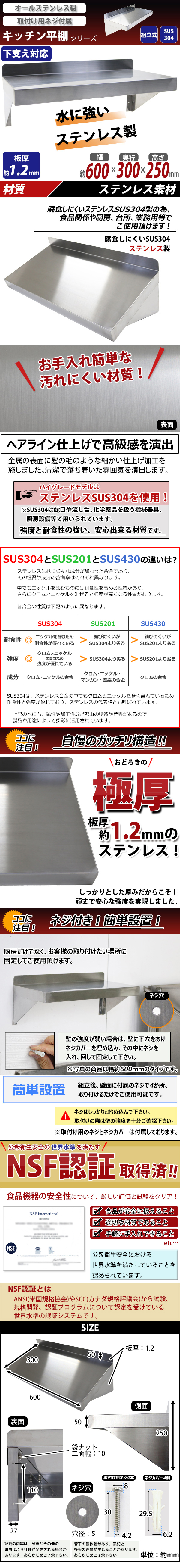 | 商品名 | 送料無料 ステンレス製 棚 シェルフ キッチン平棚 幅約600mmx奥行約300mmx高さ約250mm SUS304 ハイグレードモデル 下支え 吊り平棚 オールステンレス製 ネジ止めタイプ 吊り棚 つり棚 ステンレス平棚 キッチン 壁棚 ウォールラック 収納棚 厨房 wskshigh300600 |