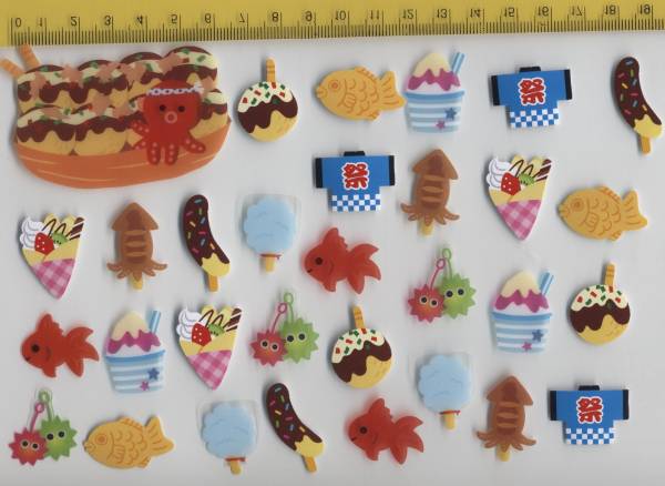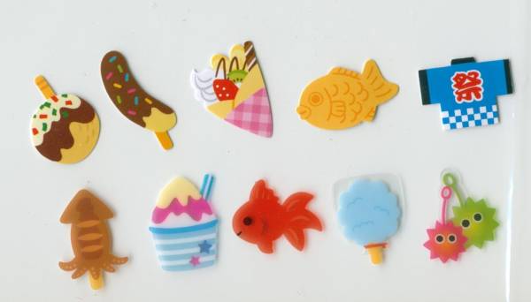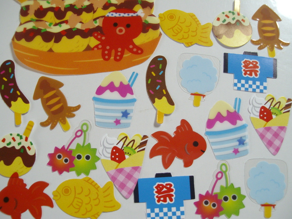 BIGシール1枚入り。金魚・はっぴ・イカ焼き・チョコバナナ・クレープ・たい焼きなど。
