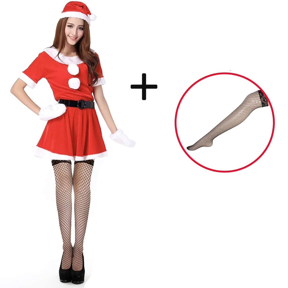 【商品内容です】 サンタ帽子、トップス、スカート、かわいい手袋、網タイツの5点セット。