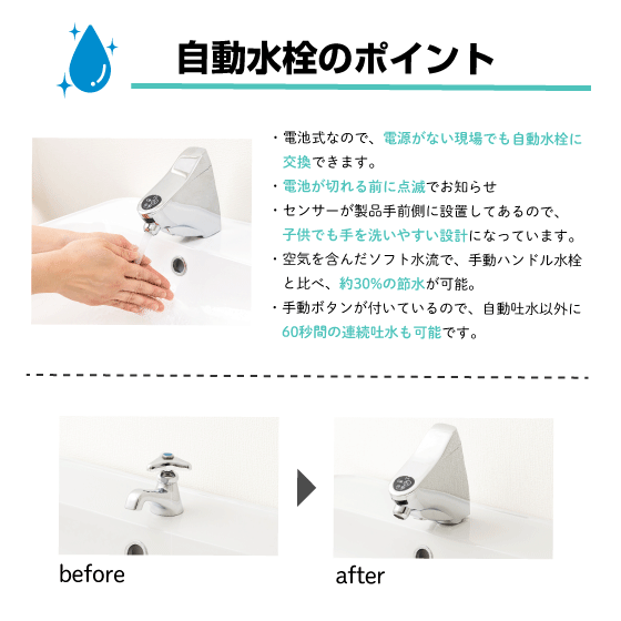 ・ 水栓に直接触れないで手を洗うことができるため衛生的で、また感染症予防にも効果的です。
