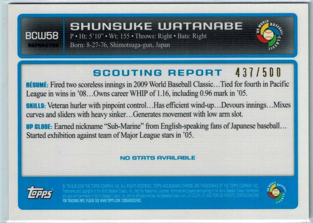渡辺俊介 500枚限定リフ - 2009 Bowman Chrome BCW58 WBCインサート 侍ジャパン 千葉ロッテマリーンズ サブマリン
