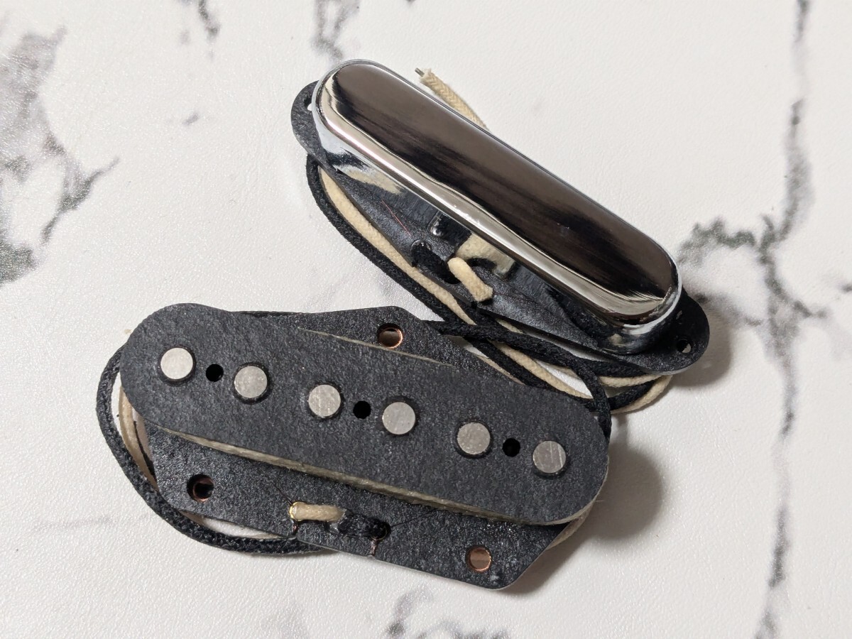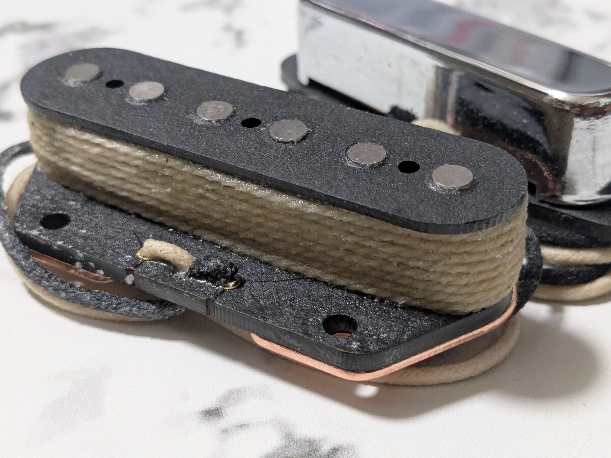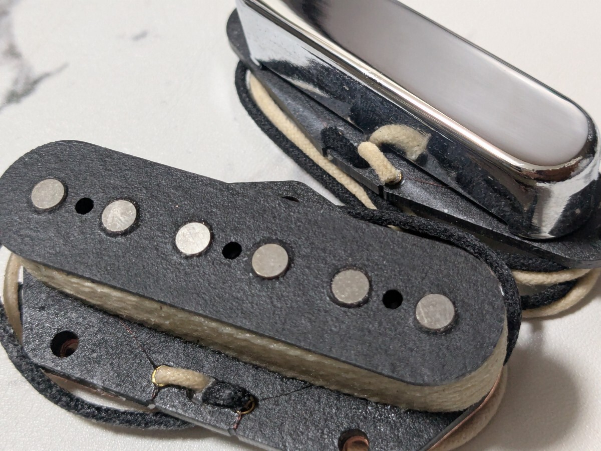 ※リアピックアップのポールピースの高さは同じですが、ビンテージの経年変化の様にボビンのトップに反りが見られる物がございますのでご了承下さいませ。(反りによるコイルの動きがビンテージサウンドの一因と言う説もあったり、経年で反った見た目を好む方もいらっしゃったり、、)