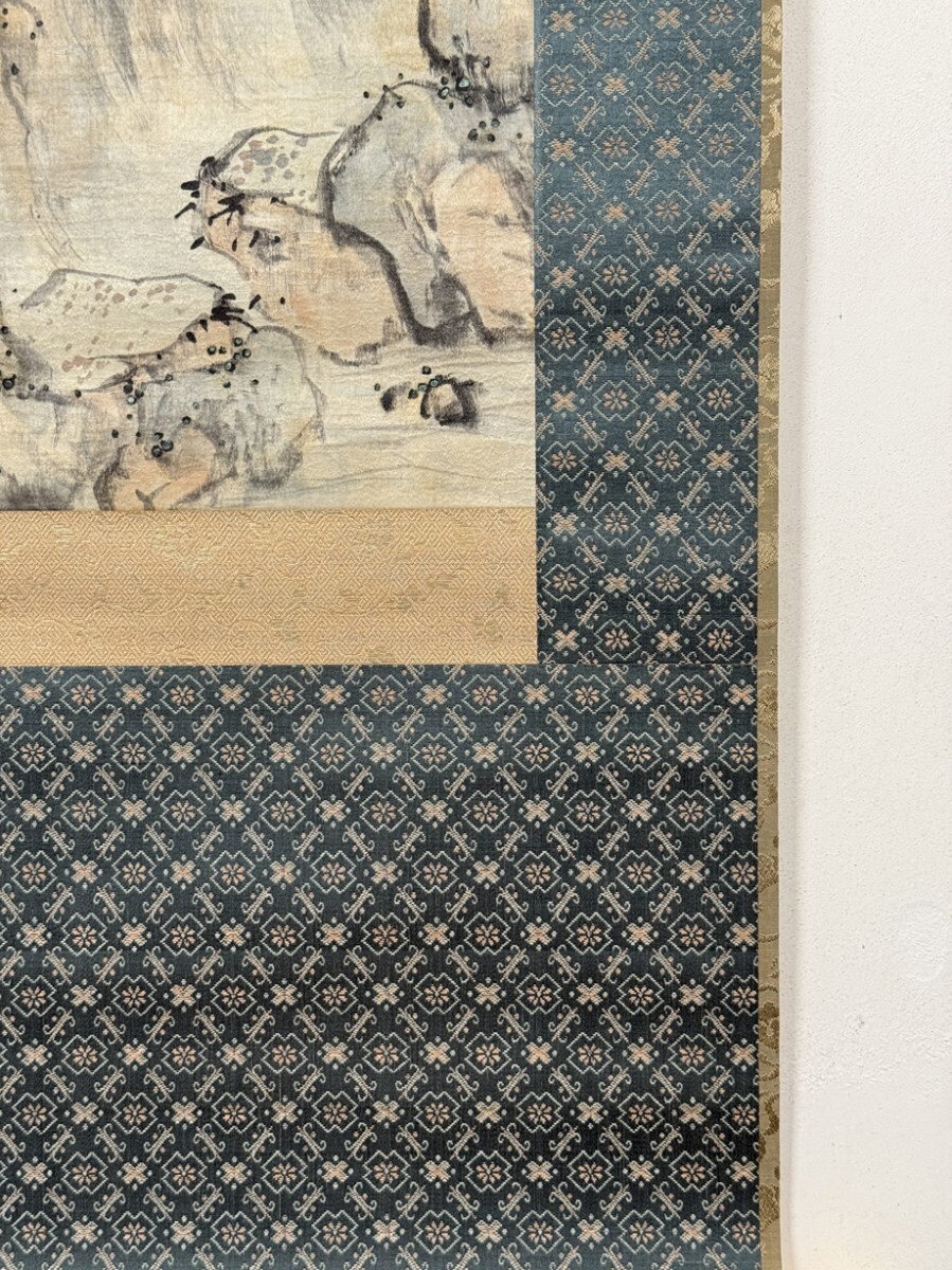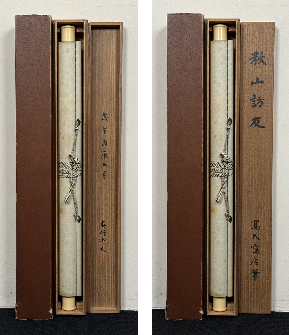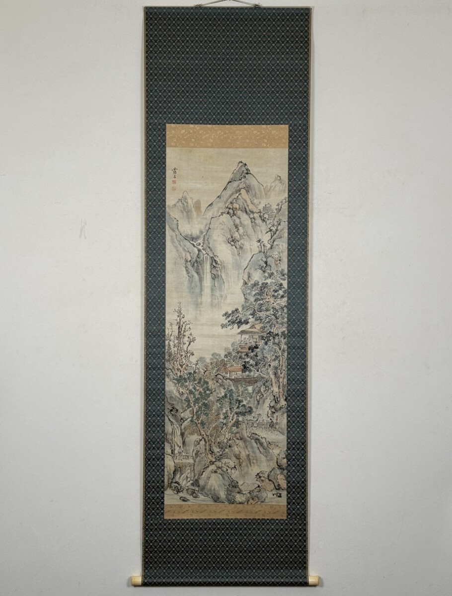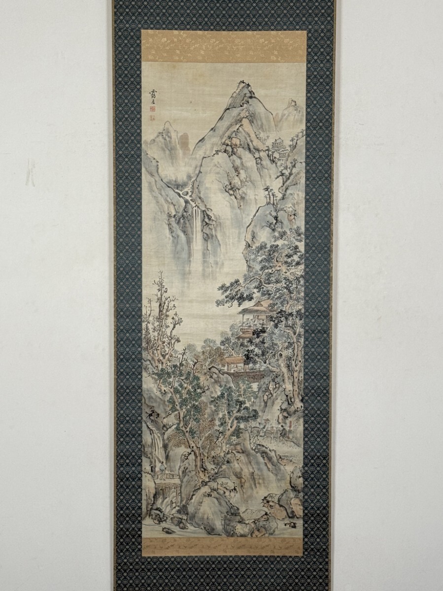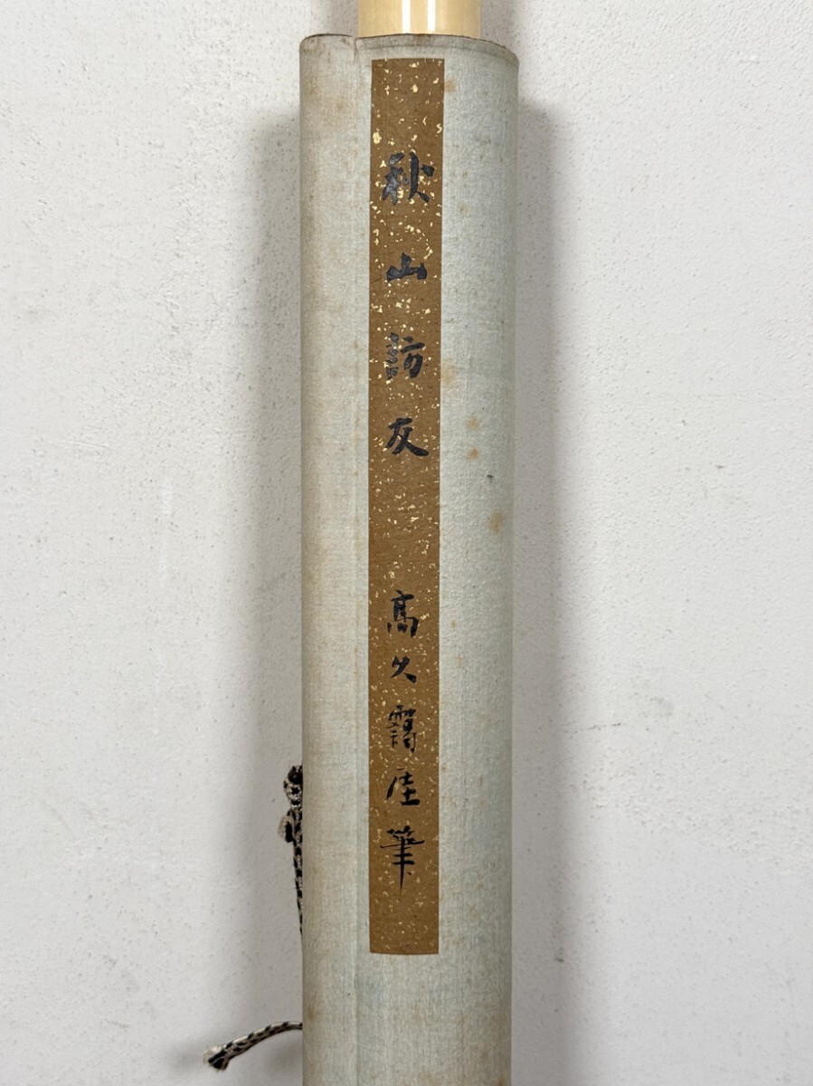 総丈サイズ…横 62 × 縦 214.5 cm 絖本着色・箱入 佳品 諸井春畦箱書並旧蔵 状態…本紙微少シミ・微少オレ 【印刷ではありません】 【真作】 高久靄厓 江戸後期の南画家。下野生。名は徴。字は子遠。通称は秋輔。別号に石窟、如樵、疎林外史など。池大雅、伊孚九に私淑し、江戸で谷文晁の門に入る。日本各地を盛んに旅し、古書画の調査や模写を行って南宗画を探求した。晩年は江戸に住み、関東文人画家らと交遊した。なかでも同門の渡辺崋山が蛮社の獄で投獄された際には、椿椿山、立原杏所らとともに救出に尽力したという。天保14年(1843)歿、48歳。 諸井春畦 実業家、書家。武蔵本庄生。名は直行。字は習郷。通称は時三郎。諸井恒平の弟。東京で日本初のビル・ブローカー業をはじめた。書は西川春洞に学んだ。明治書道会会長。大正8年(1919)歿、54歳。 |