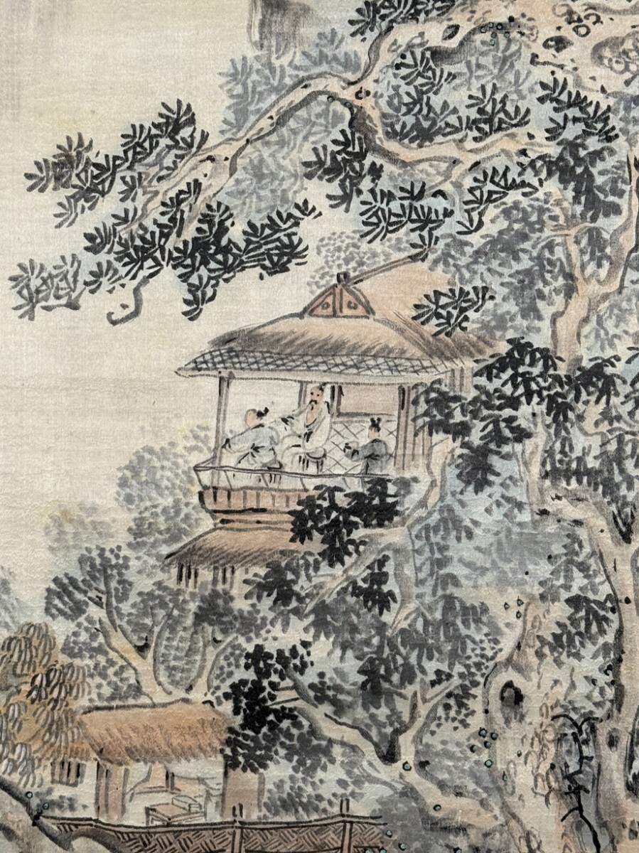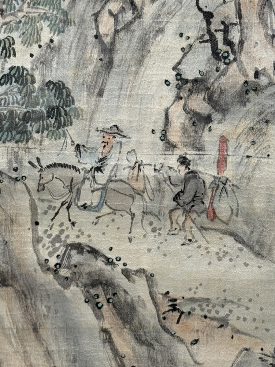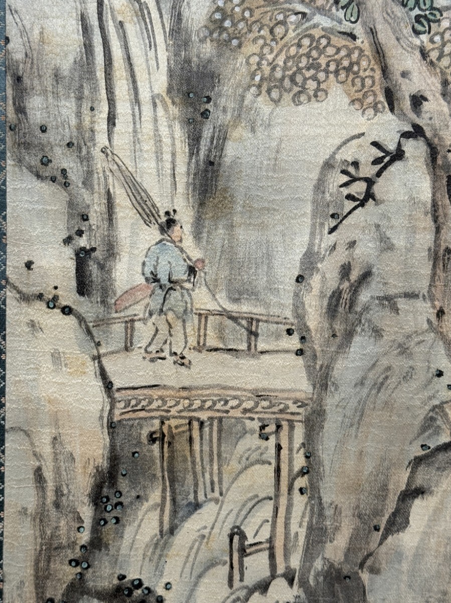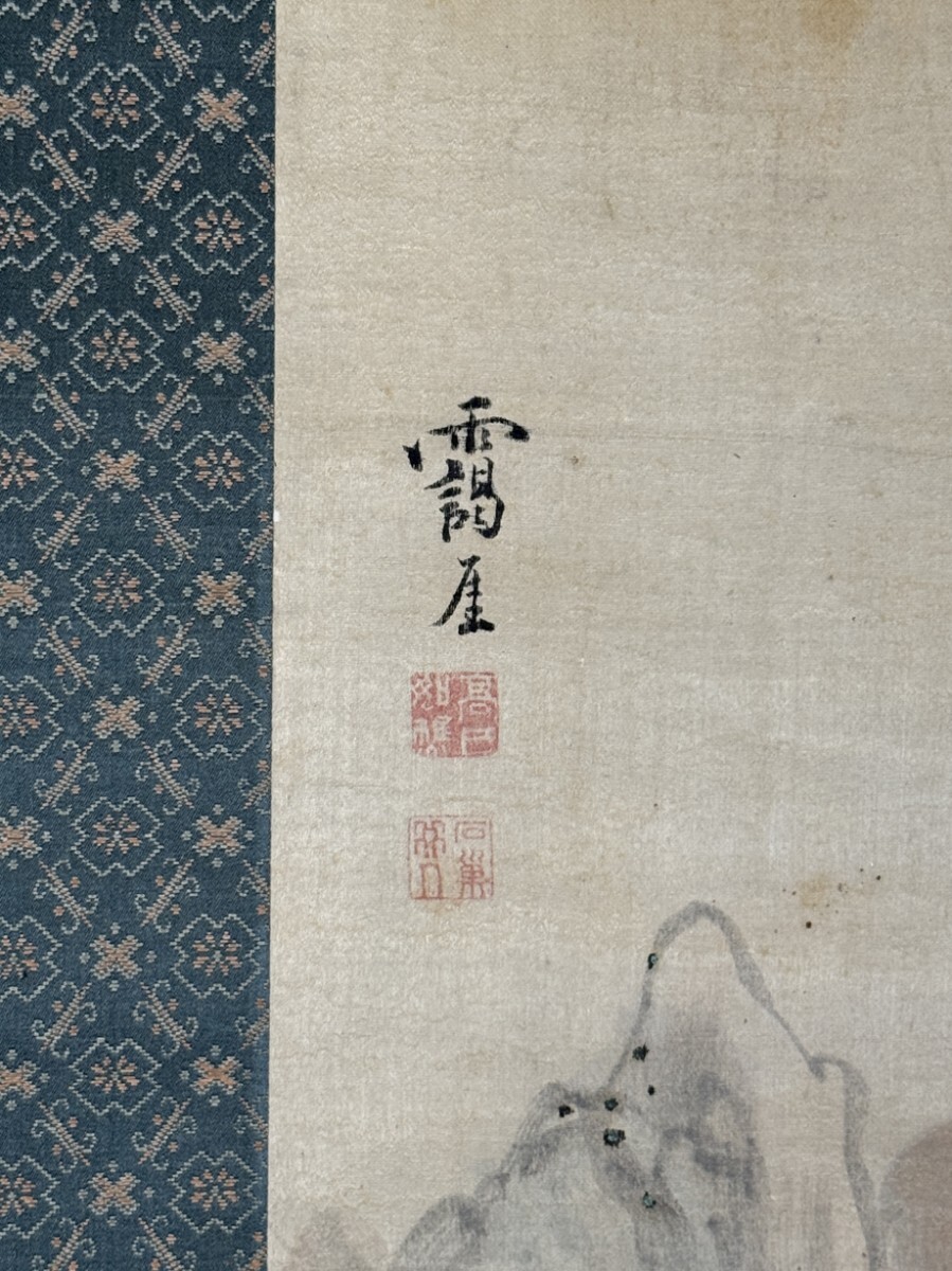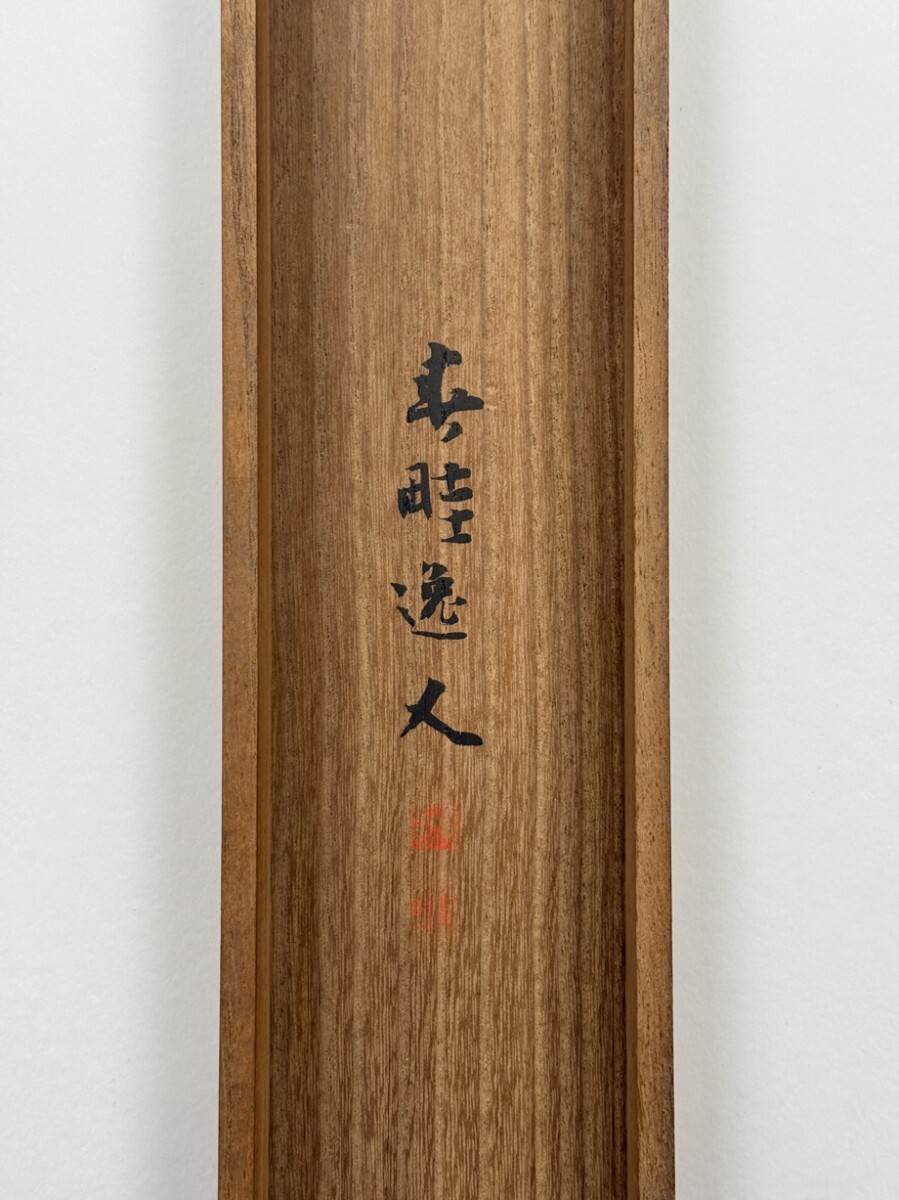 総丈サイズ…横 62 × 縦 214.5 cm 絖本着色・箱入 佳品 諸井春畦箱書並旧蔵 状態…本紙微少シミ・微少オレ 【印刷ではありません】 【真作】 高久靄厓 江戸後期の南画家。下野生。名は徴。字は子遠。通称は秋輔。別号に石窟、如樵、疎林外史など。池大雅、伊孚九に私淑し、江戸で谷文晁の門に入る。日本各地を盛んに旅し、古書画の調査や模写を行って南宗画を探求した。晩年は江戸に住み、関東文人画家らと交遊した。なかでも同門の渡辺崋山が蛮社の獄で投獄された際には、椿椿山、立原杏所らとともに救出に尽力したという。天保14年(1843)歿、48歳。 諸井春畦 実業家、書家。武蔵本庄生。名は直行。字は習郷。通称は時三郎。諸井恒平の弟。東京で日本初のビル・ブローカー業をはじめた。書は西川春洞に学んだ。明治書道会会長。大正8年(1919)歿、54歳。 |