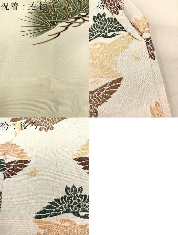 羽織【正絹・五つ紋】の状態は接写画像のように右袖に薄い汚れがございますが その他特に目立ったシミ汚れなどもなく大変良い状態です。 長襦袢【化繊】の状態は特に目立ったシミ汚れなどもなく大変良い状態です。 袴【正絹】の状態は接写画像のように前・後ろに薄い汚れがございますが その他特に目立ったシミ汚れなどもなく大変良い状態です。 大変上質な逸品になります。 お安く出品致しますので、是非この機会にいかがでしょうか? |