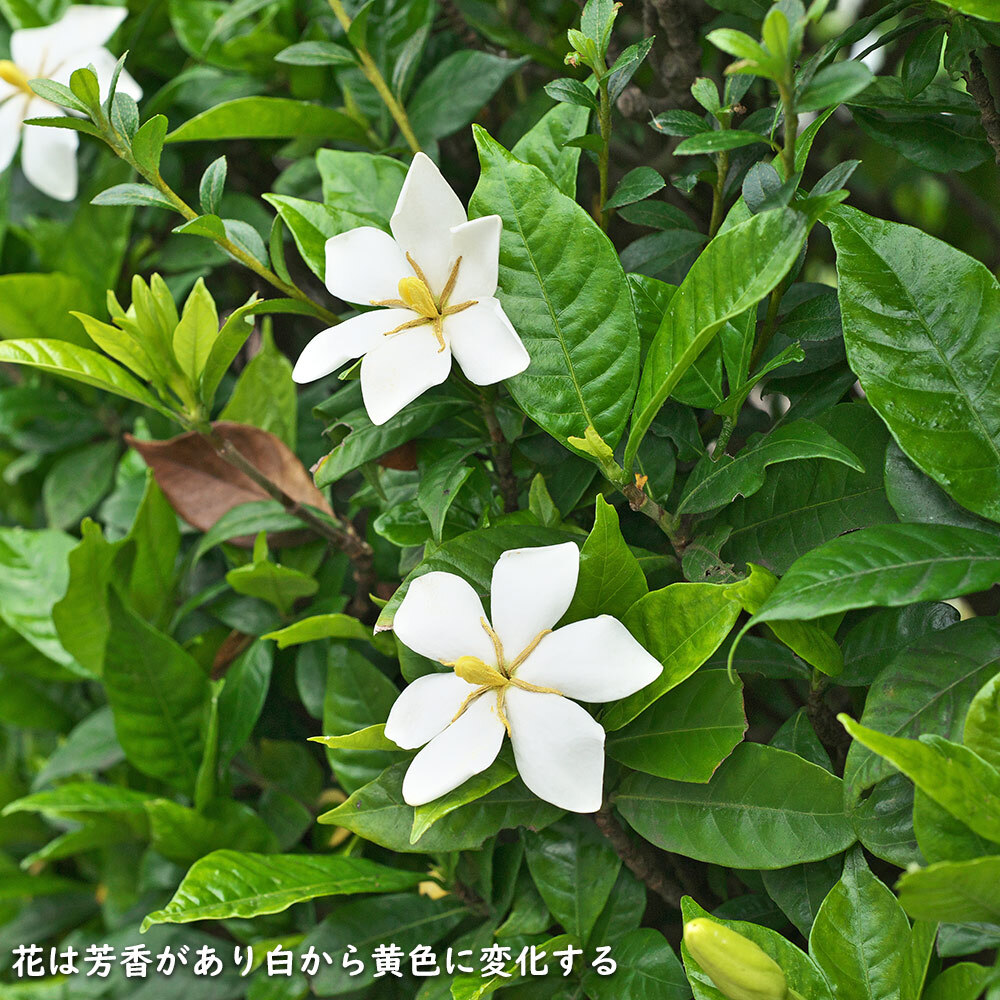 クチナシは香りが良い花が有名です。梅雨の時期に白く綺麗な約5cm前後の花が咲きます。多くの品種があり人気があります。果実は11~12月ごろになります。常緑の低木で刈り込みが可能ですので、玉作りや生垣、グランドカバーにと用途は様々です。