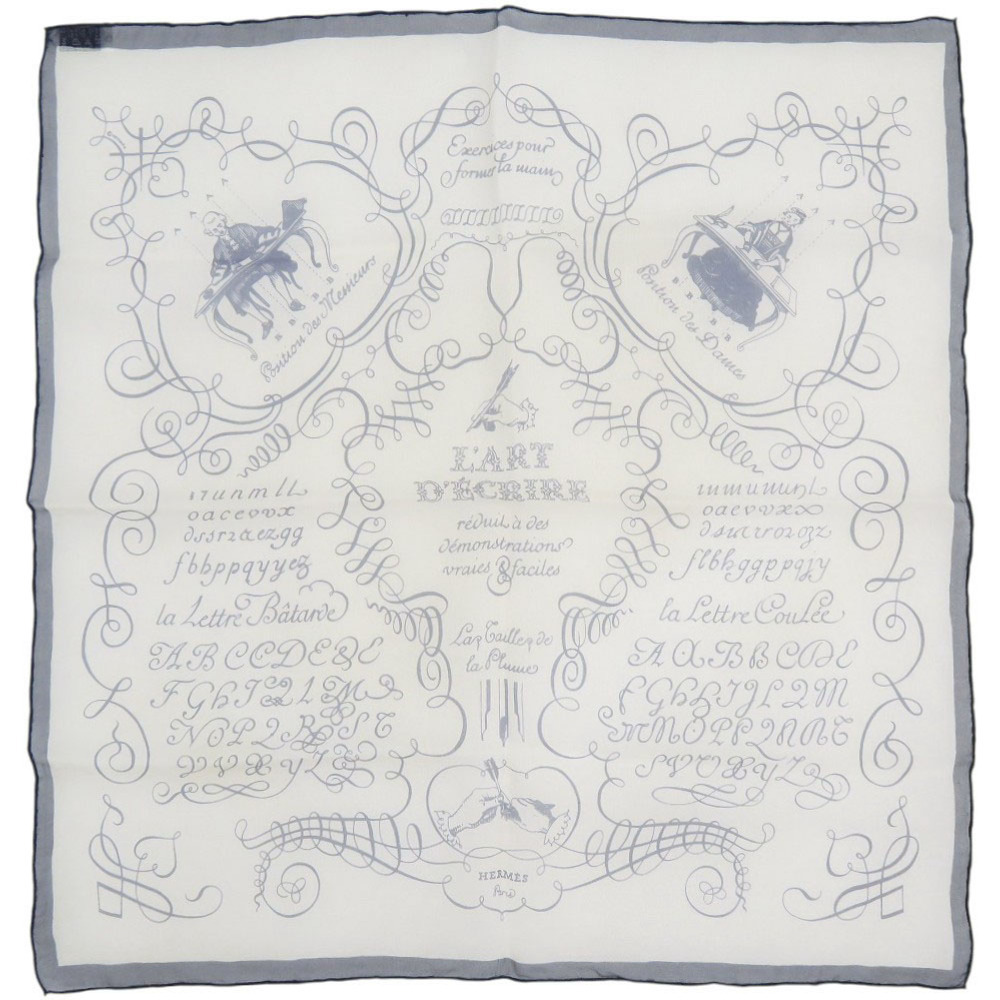 美品 エルメス カレ45 LART DECRIRE 書の芸術 シルク ホワイト系 ネイビー スカーフ 0821 HERMES