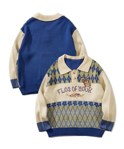 参考商品名:HOOK -original- 古着風 レトロ調 配色 アーガイル柄ポロ襟ニット