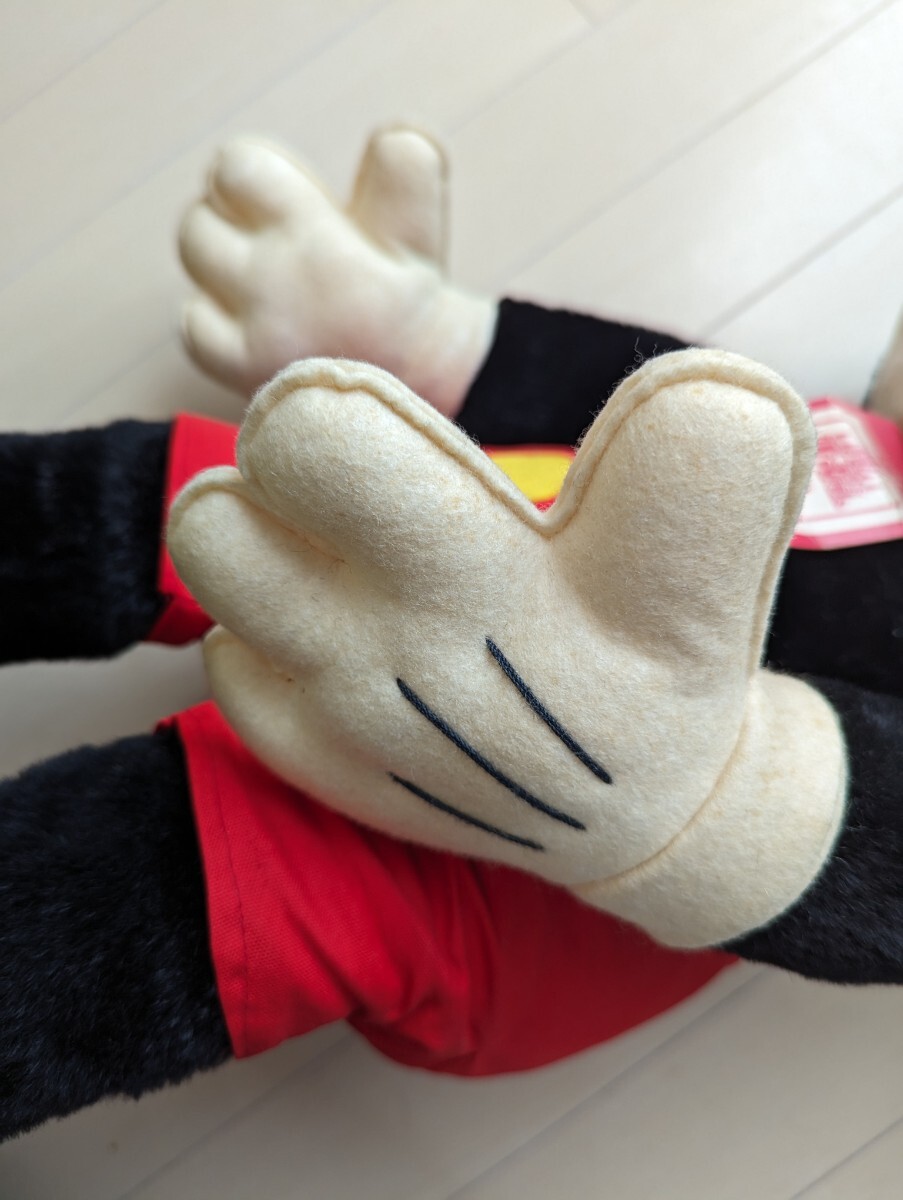 ミッキーの手がだいぶ黄ばんでいて、黄色の足先に黒ずみが見られます。左目が少し削れています。