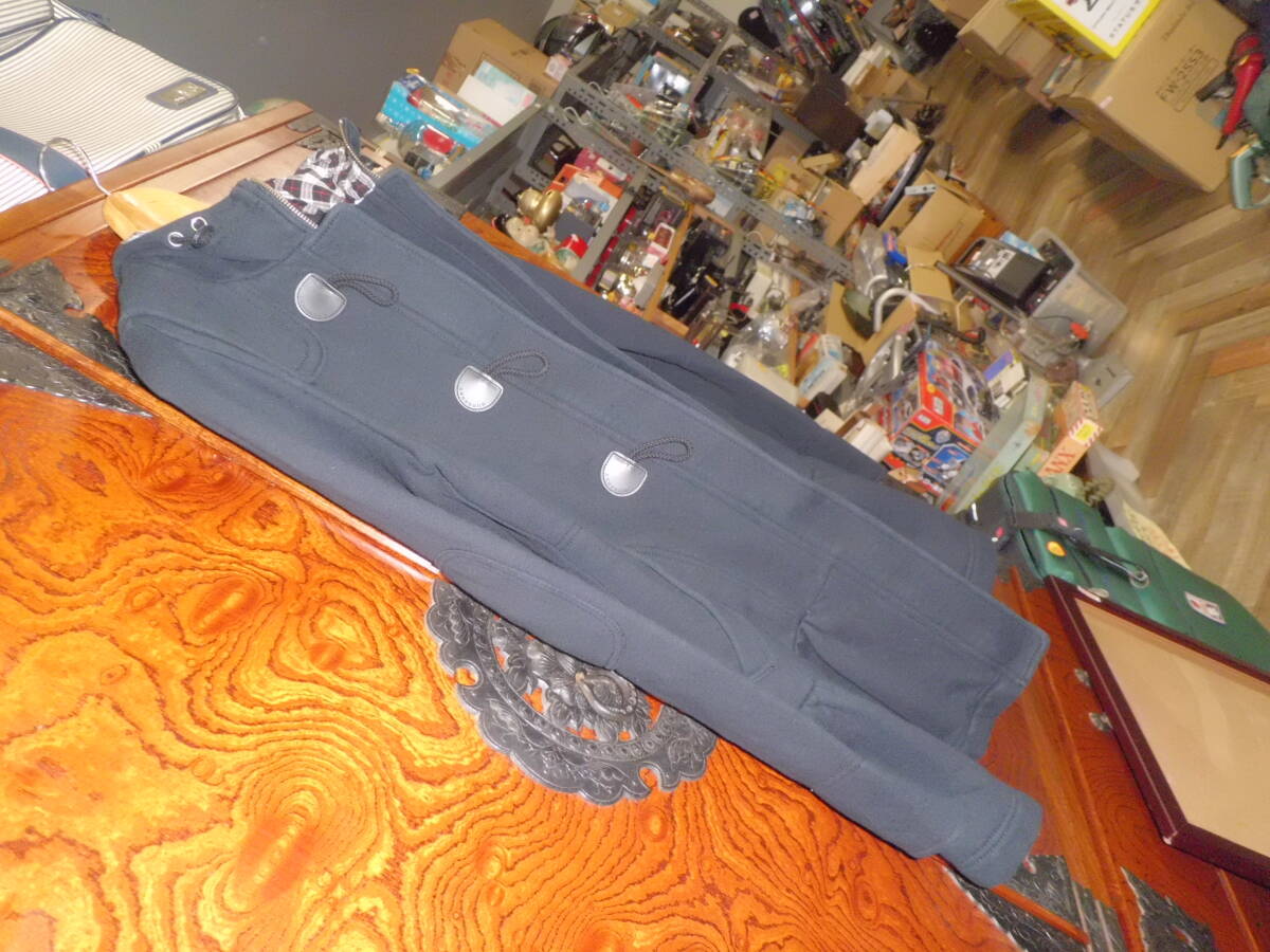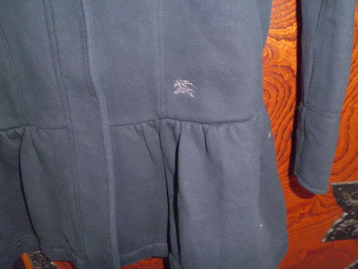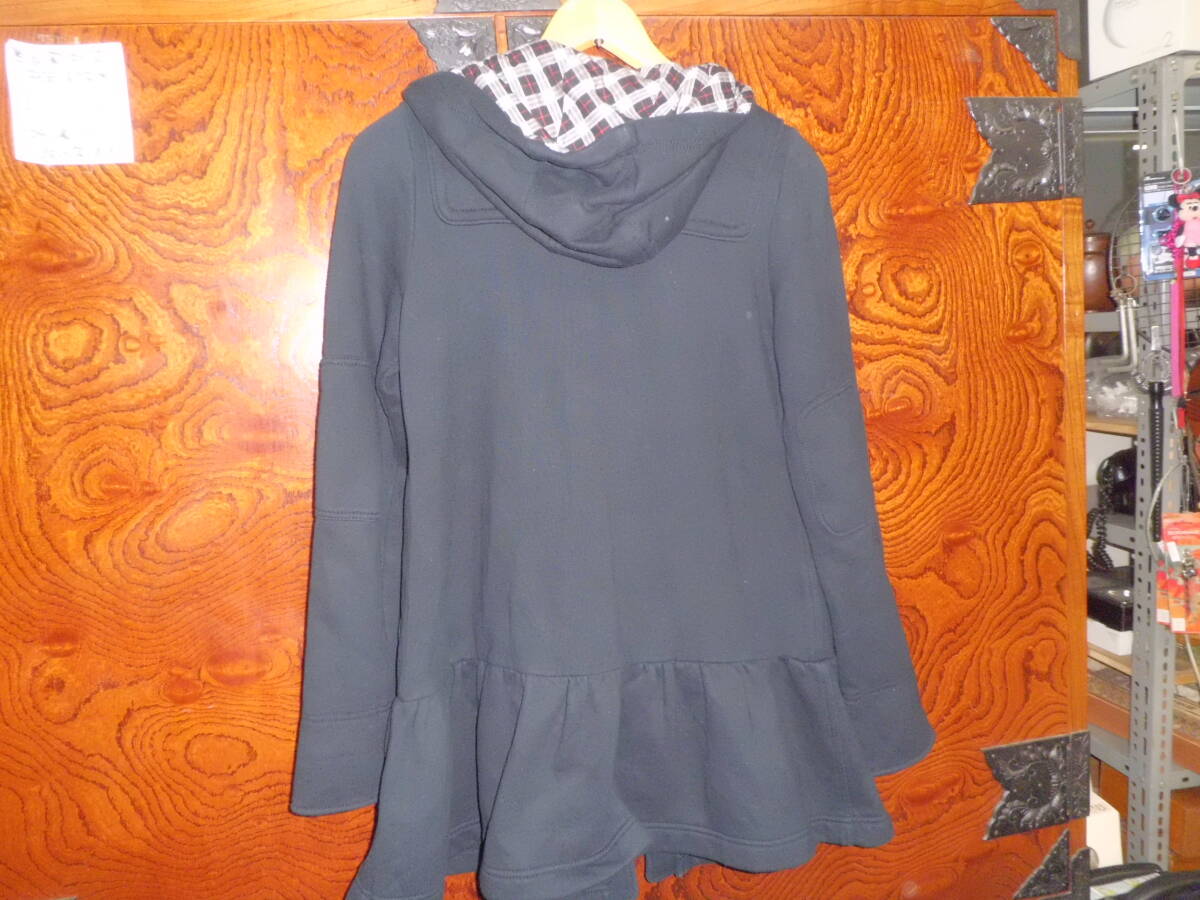 程度の良いお品でございます お色はブルー系で綿&レザー製で下部フリルついてオシャレです サイズ約身丈71cm 肩幅44cm 袖丈38cm 破れ汚れほつれなどは見当たり解れ丁寧に梱包してお送りいたします